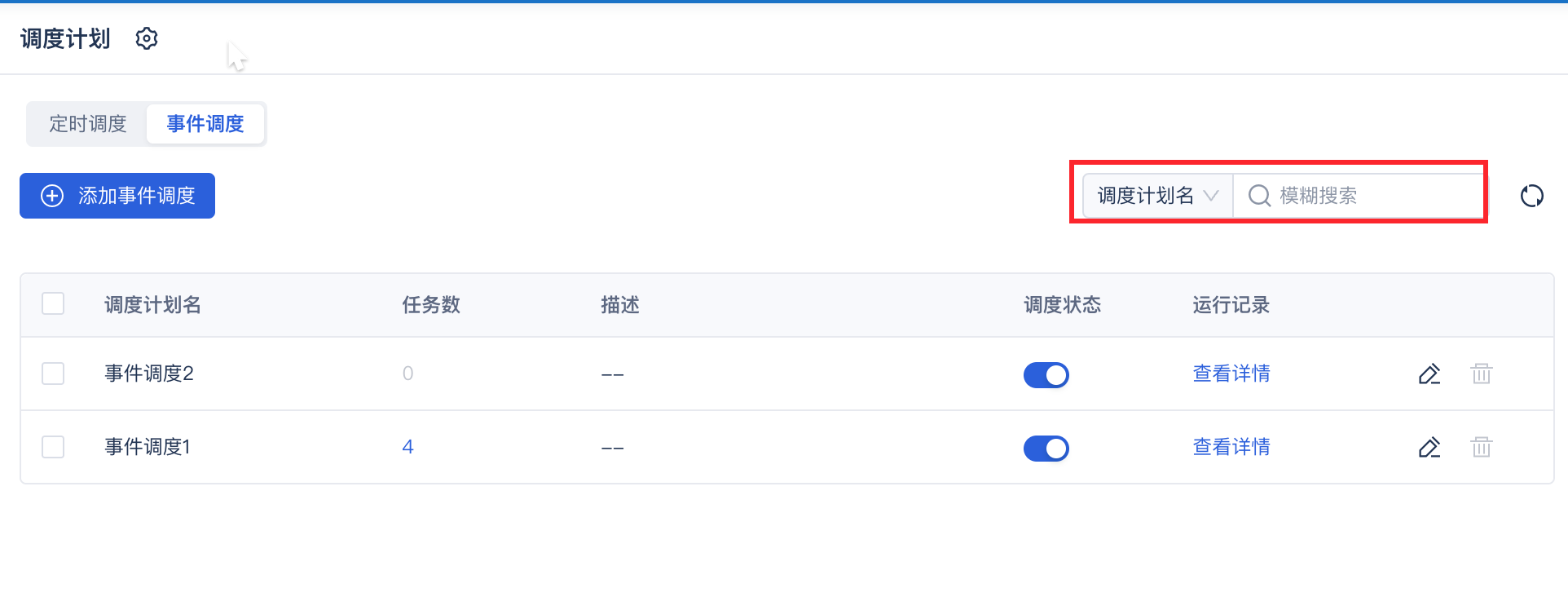 调度计划页面有两个 Tab,分别为「定时调度」和「事件调度」。