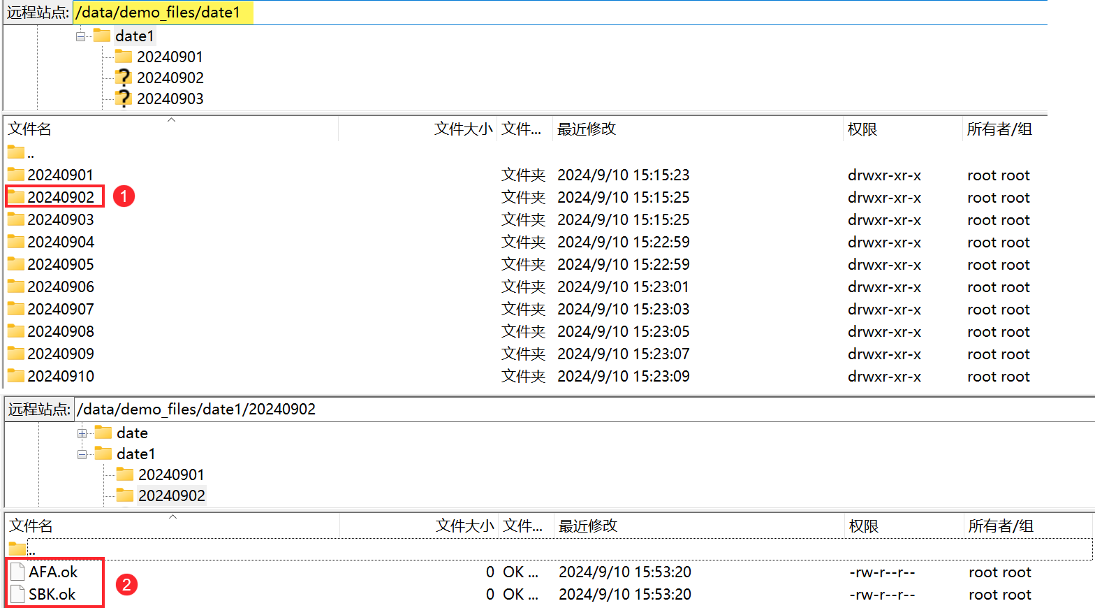 2)本文示例中,将 .ok 文件传输到/data/demo_files/date1下,任务运行后,该目录下内容如下图所示: