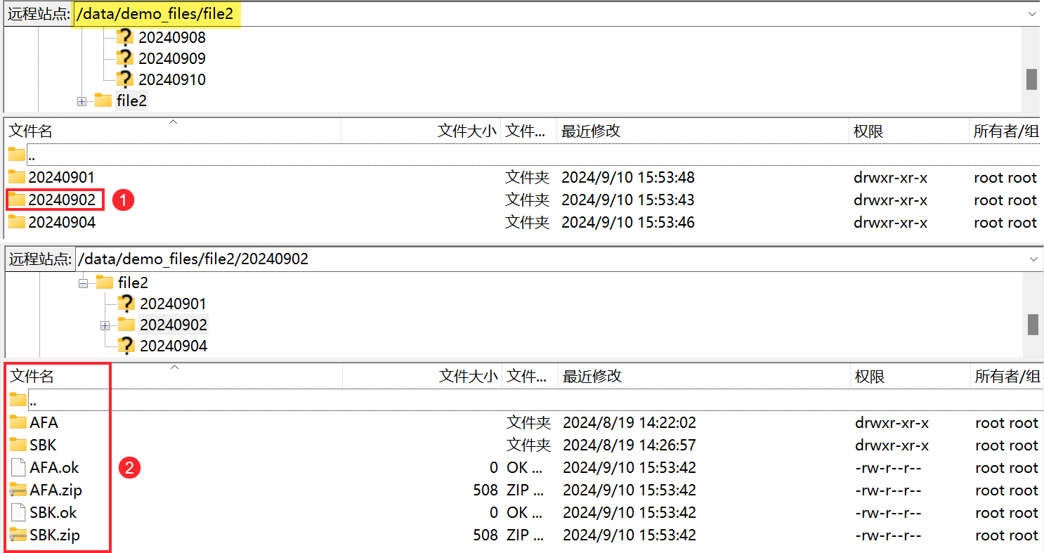 遍历压缩包所在路径/data/demo_FR/cs下,符合条件的 .ok 文件(用 2.4.1 节生成的参数name过滤文件),传输到/data/demo_files/date1下的日期文件夹中。