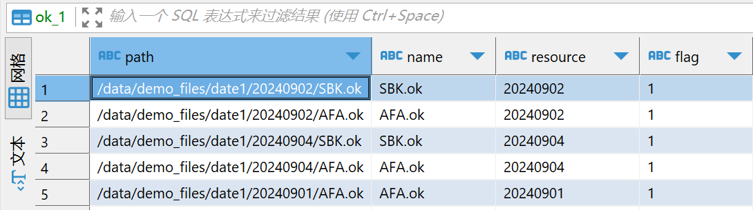 注:代码含义:找到参数值下的 .ok、.sql、.del文件,输出文件路径和名称到 /data/demo_files/test 路径下的 date.csv 文件中;本文示例中,只有 .ok 文件,代码不影响方案实现;date.csv 的路径用户根据实际情况自定义。