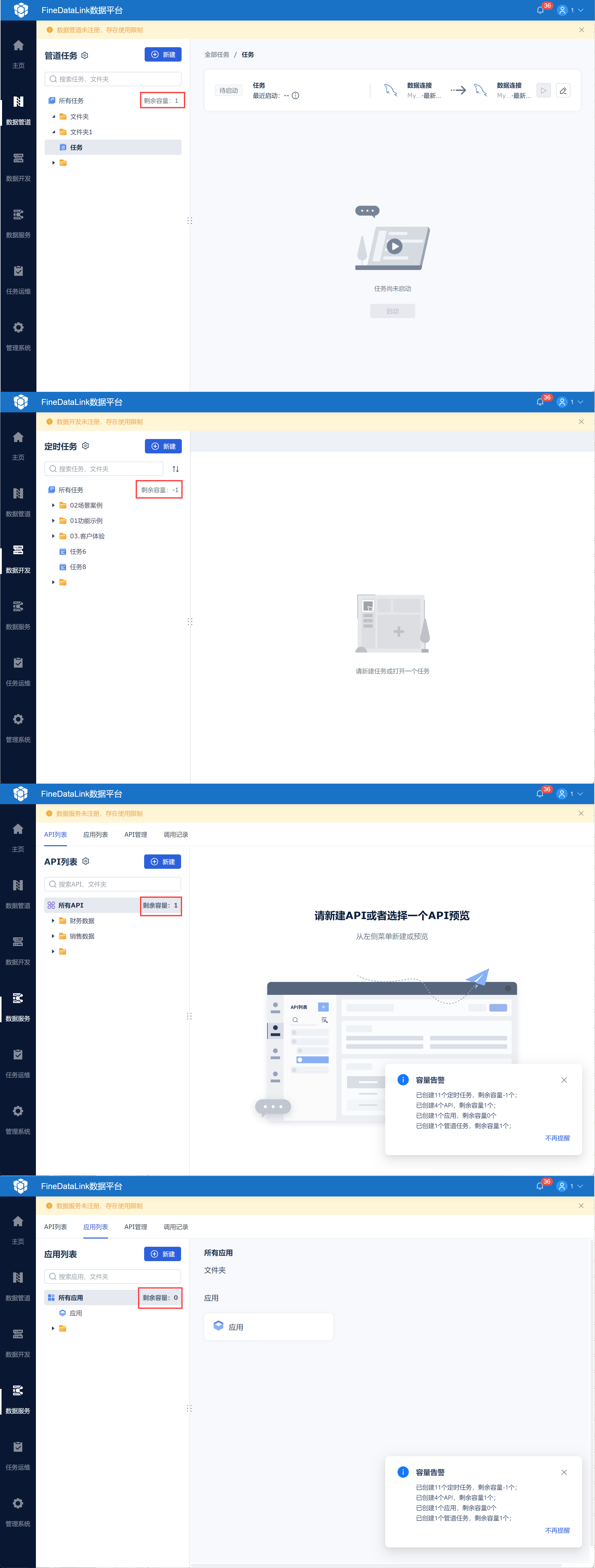 在数据管道、数据开发、API列表、应用列表界面,分别展示了系统的剩余任务容量,如下图所示: