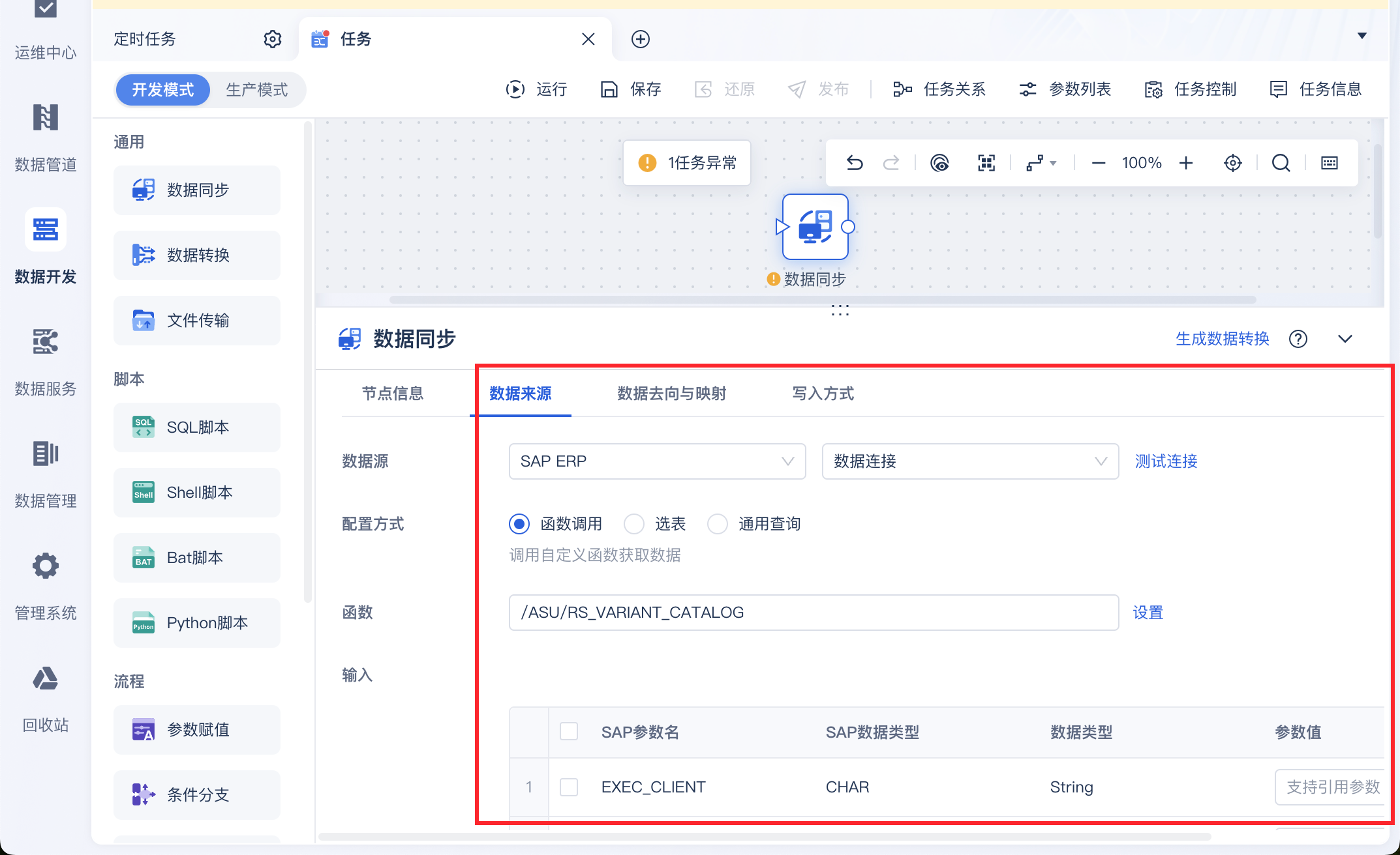 若取出后的数据需要进行数据开发后落库,可以使用「数据转换」中的「SAP ERP输入」。