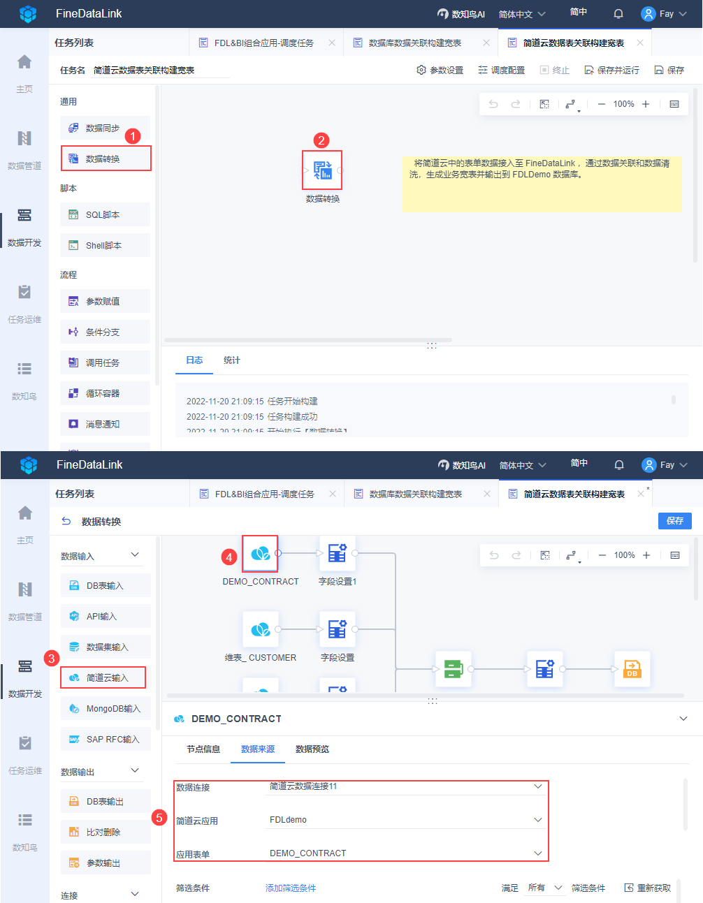 2)将简道云中的表单数据接入至 FineDataLink ,通过数据关联和数据清洗,生成业务宽表并输出到 FDLDemo 数据库。