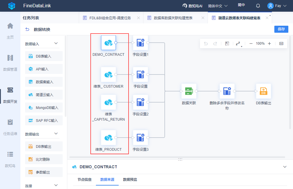 将 FRDemo 数据库中的「DEMO_CONTRACT」数据表与「CUSTOMER」根据「客户ID」关联、与「DEMO_CAPITAL_RETURN」根据「合同ID」关联、与「DEMO_PRODUCT」根据「产品ID」关联,生成一张业务宽表。