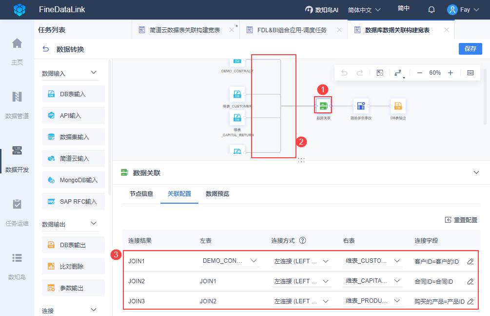 1)将 FRDemo 数据库中的数据接入至 FineDataLink ,通过数据关联和数据清洗,生成业务宽表并输出到 FDLDemo 数据库。