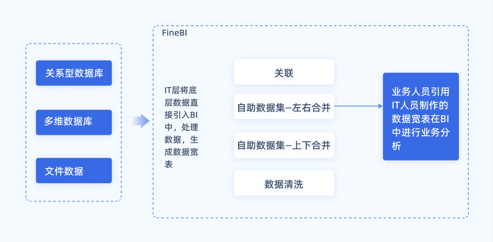 IT人员在FineBI中直接连接数据库数据,通过自助数据集对原始数据进行数据清洗和处理,形成业务人员可用的数据宽表;