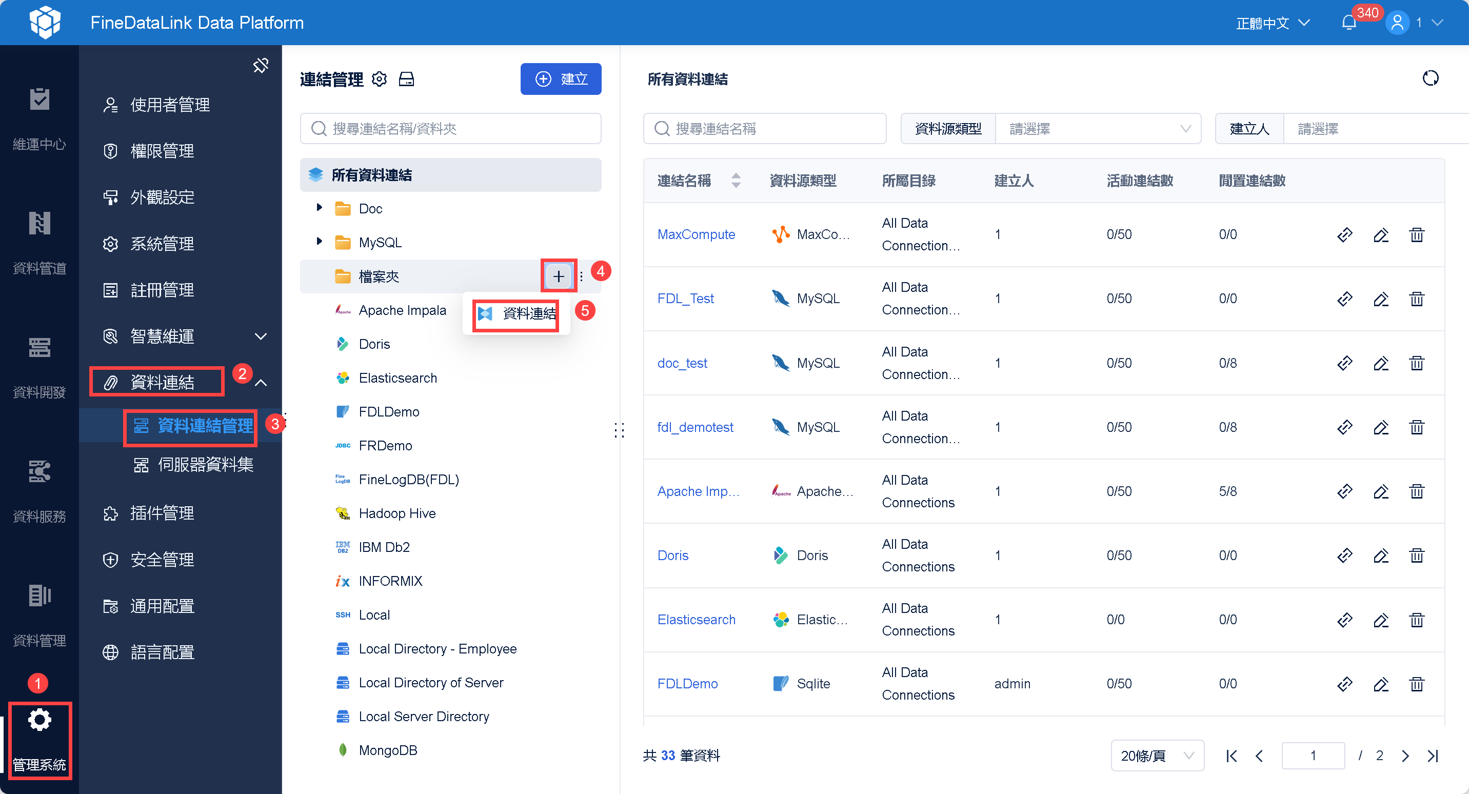 1)管理者登入 FDL 工程,點選「管理系統>資料連結>資料連結管理」,選中某個資料夾後,建立資料連結。如下圖所示: