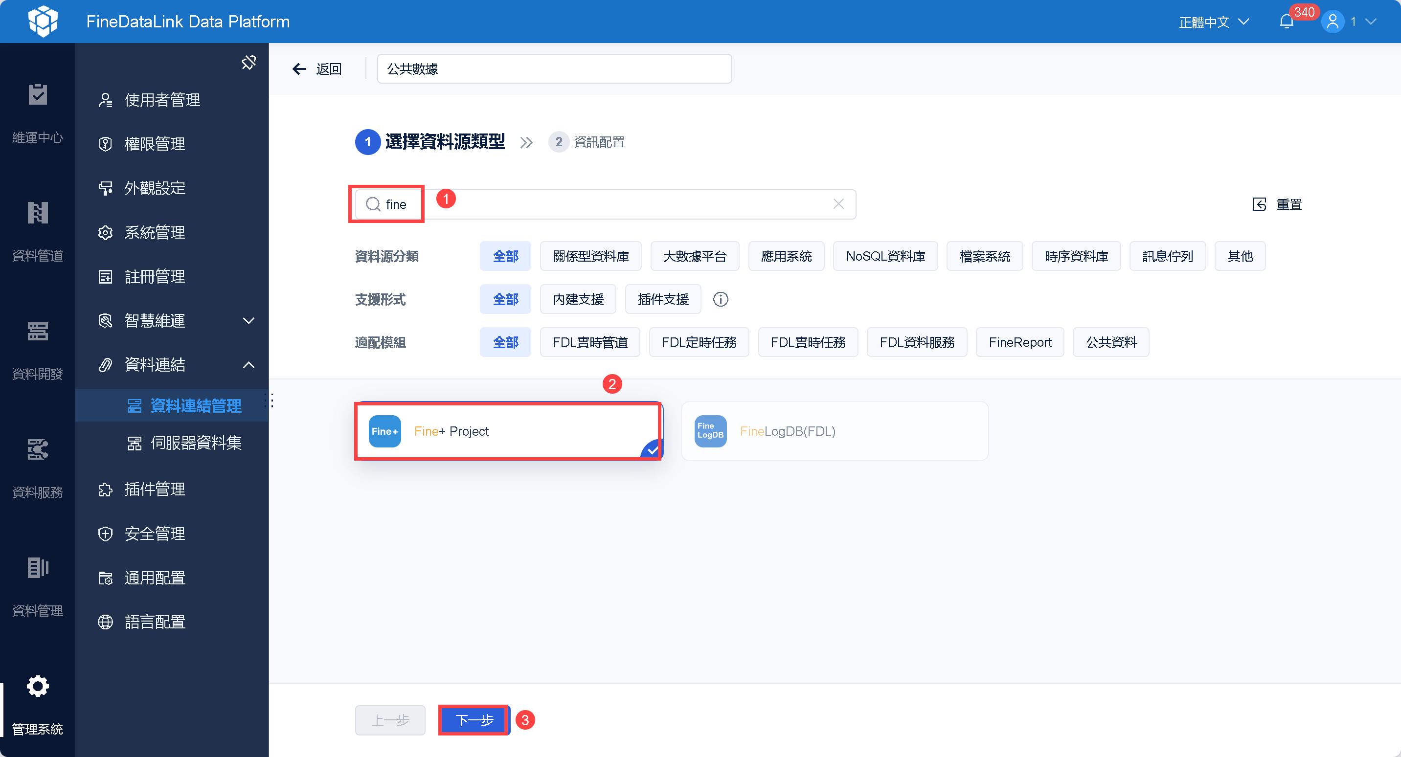 3)可根據資料源分類、支援形式、適配模組、資料源名稱篩選資料庫。如下圖所示: