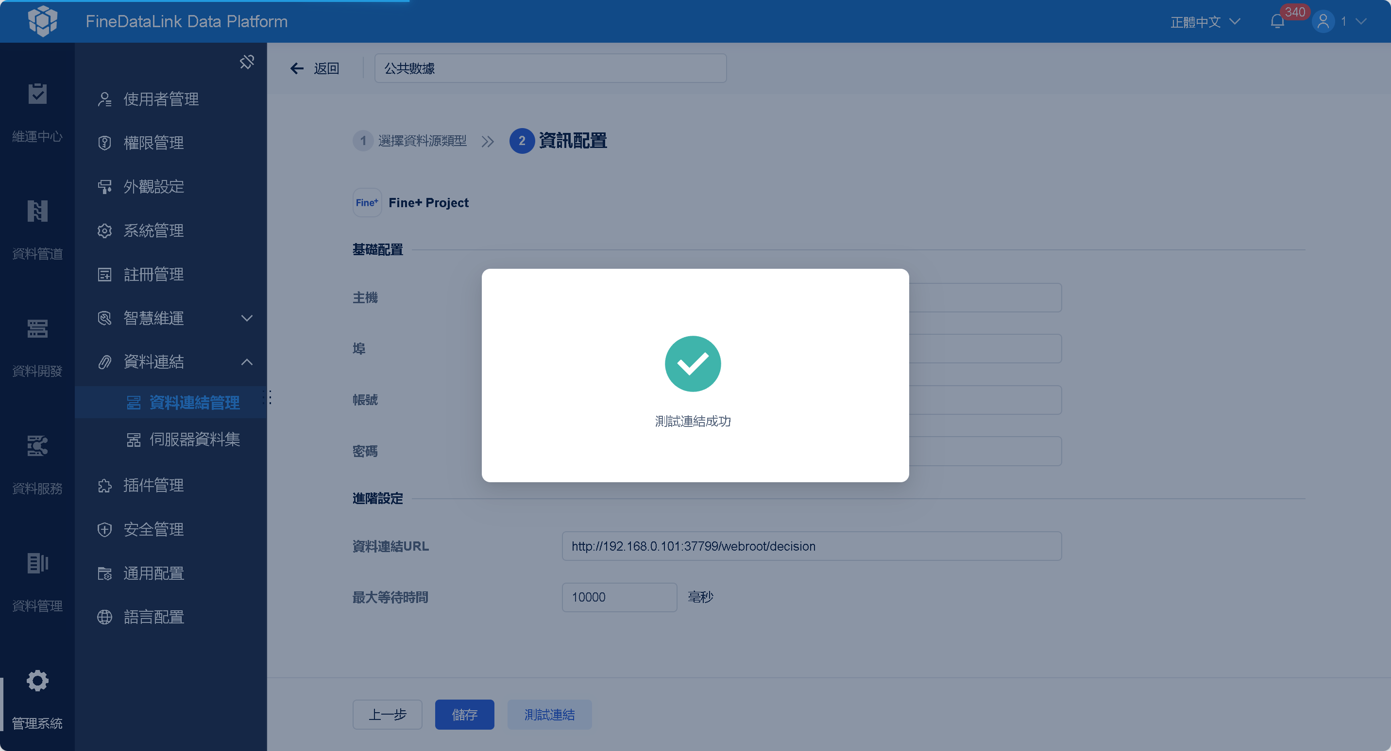 5)點選「測試連結」,若連結成功則「儲存」該連結。如下圖所示: