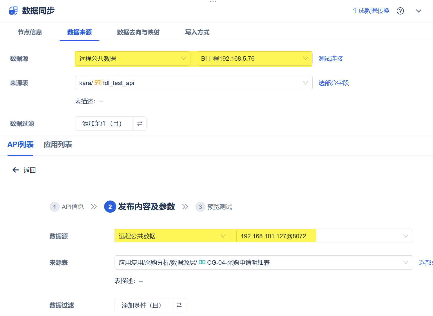 FineBI 和 FineDataLink 中支援建立「遠端公共資料」資料連結,配置需要遠端存取的 FineBI 工程後,可在 FineDataLink 定時任務「資料同步」「參數指派」「資料集輸入」;