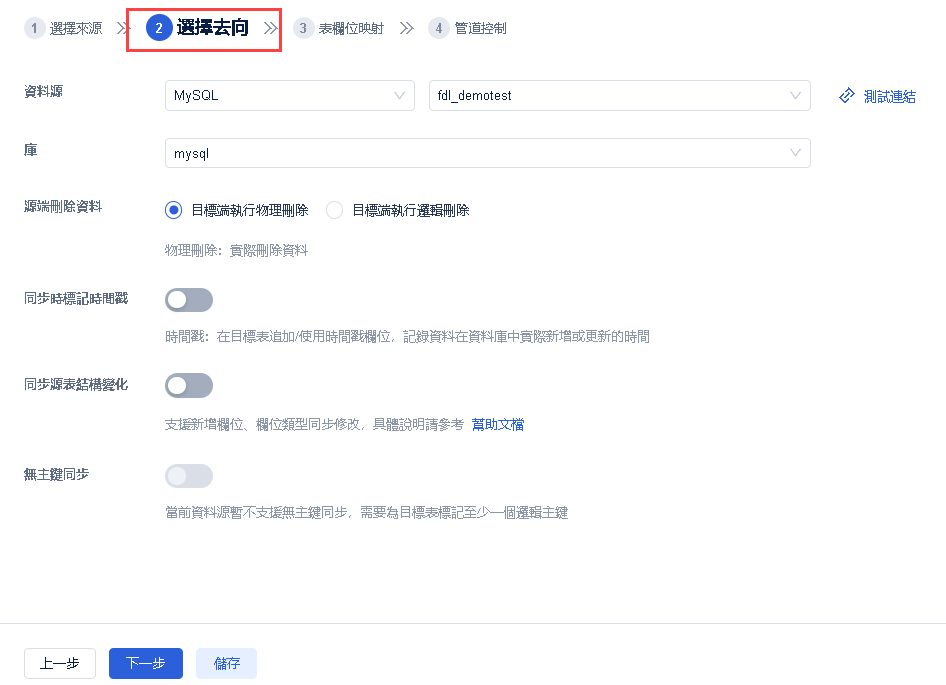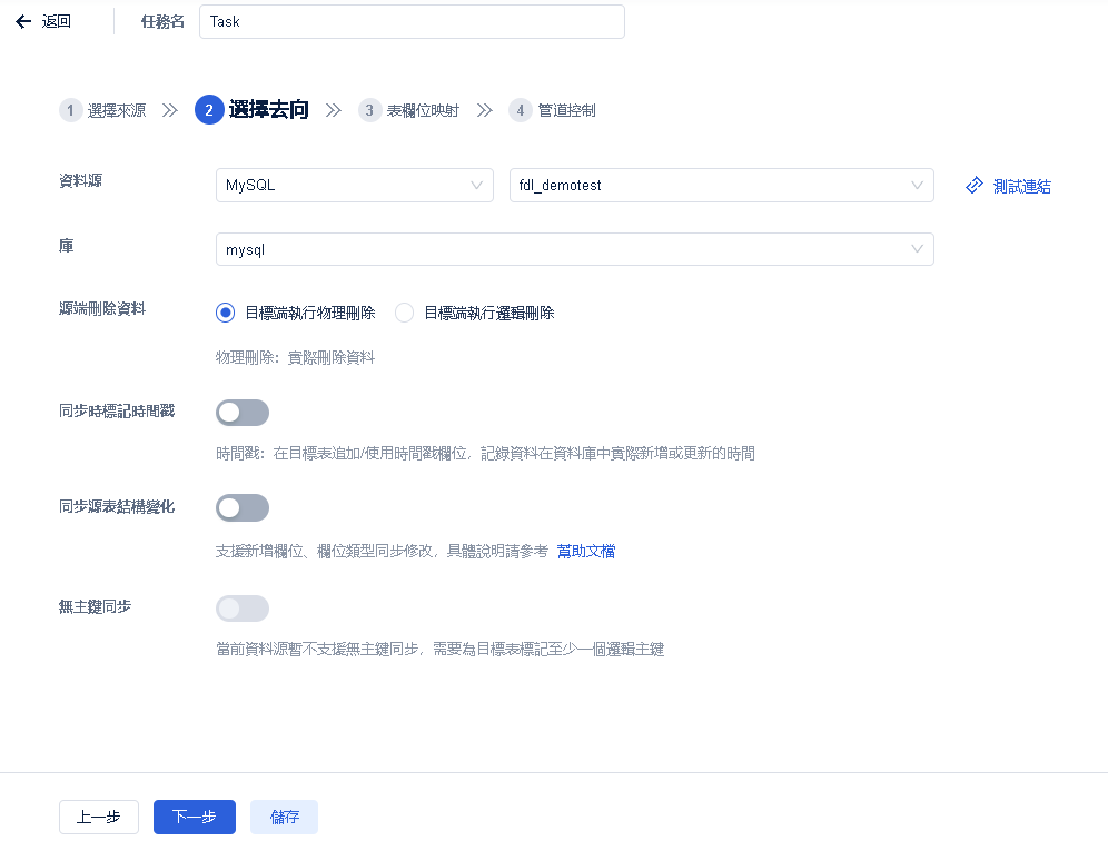 注:「目標端執行邏輯刪除」、「同步時標記時間戳」功能僅在管道任務建立和暫存狀態時可進行配置,運作中、暫停狀態的任務不允許調整配置。