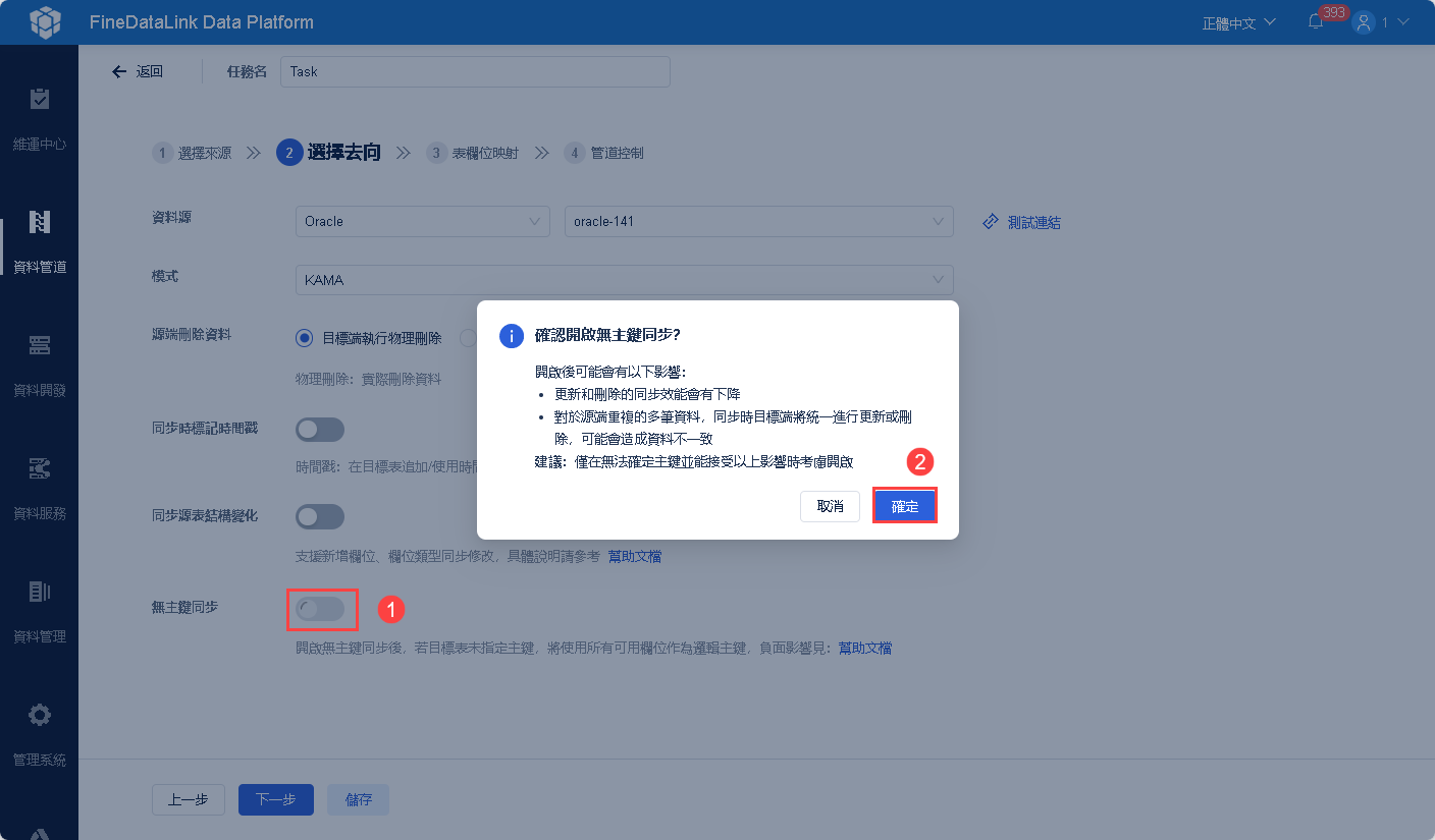 4.1.1 及之後版本,選擇去向步驟中,資料源為 Oracle/GP/SQLServer 資料庫時,支援無主鍵同步;4.1.11.2 及之後版本,選擇去向步驟中,資料源為 YMatrix 資料庫時,支援無主鍵同步。