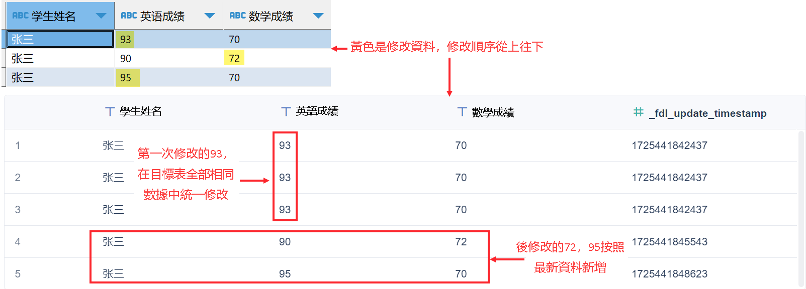 • 源端多條相同資料修改多條,按照改動順序,源端第一次修改的資料,目標端對應的那個欄位也全部同時修改;之後修改的資料,按照最新資料新增。