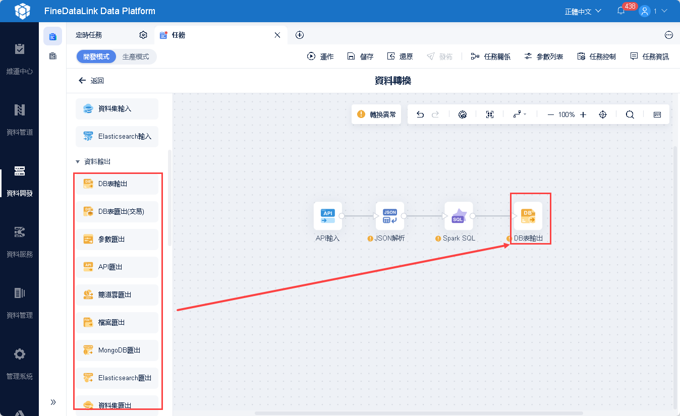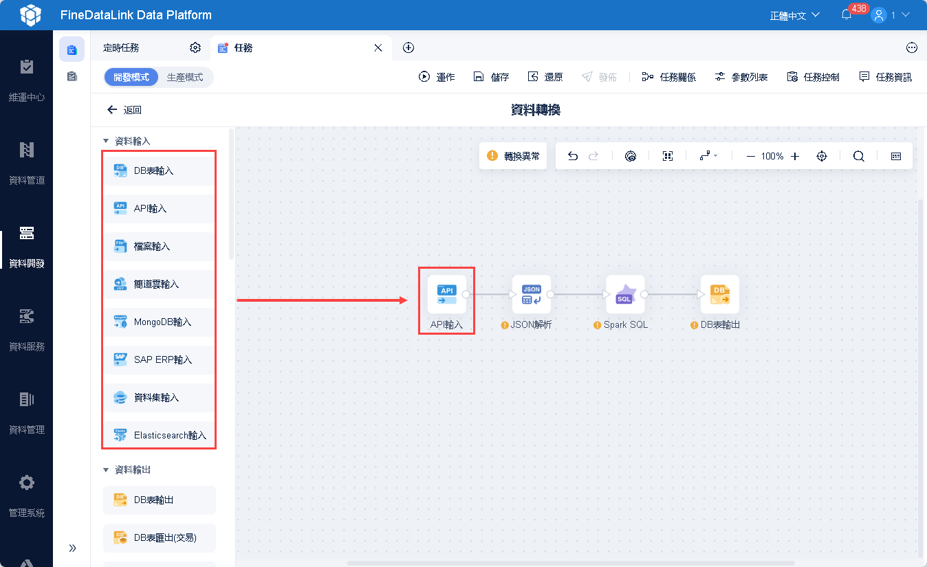 首先進入「資料轉換」節點中,根據資料源類型進行資料輸入。如下圖所示: