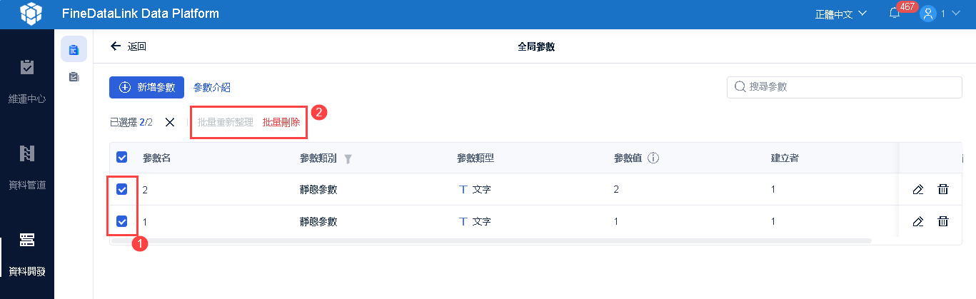 對於指派參數,使用者可以進行批量的重新整理,以便在除錯的時候進行查看,同時對於所有的全局參數,可以批量刪除,如下圖所示: