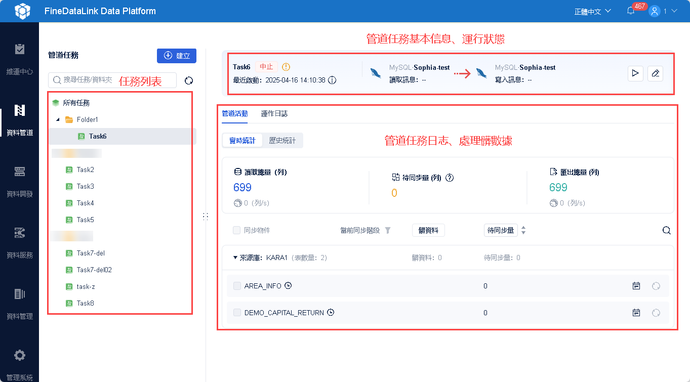 | 管道任務維運 | 使用者點選已啟動過的管道任務,可查看當前任務的同步詳情、運作日誌: