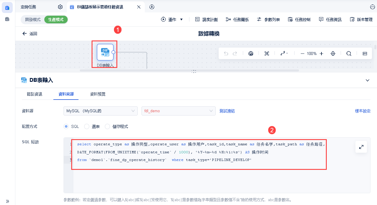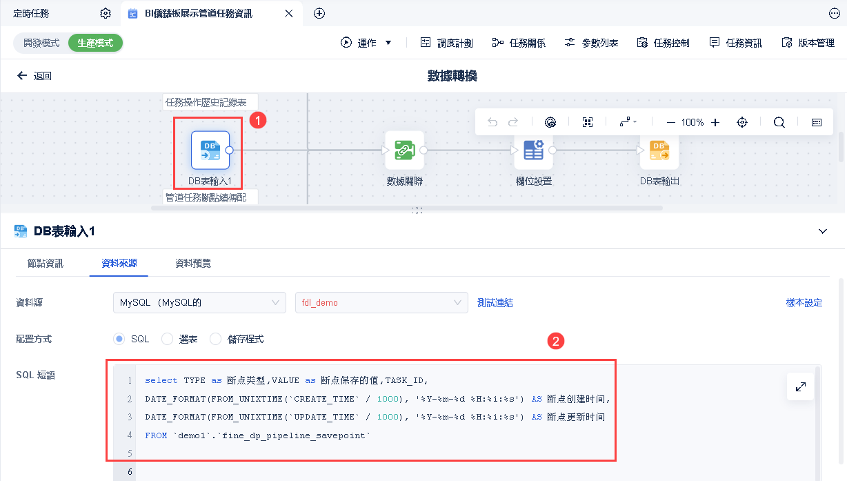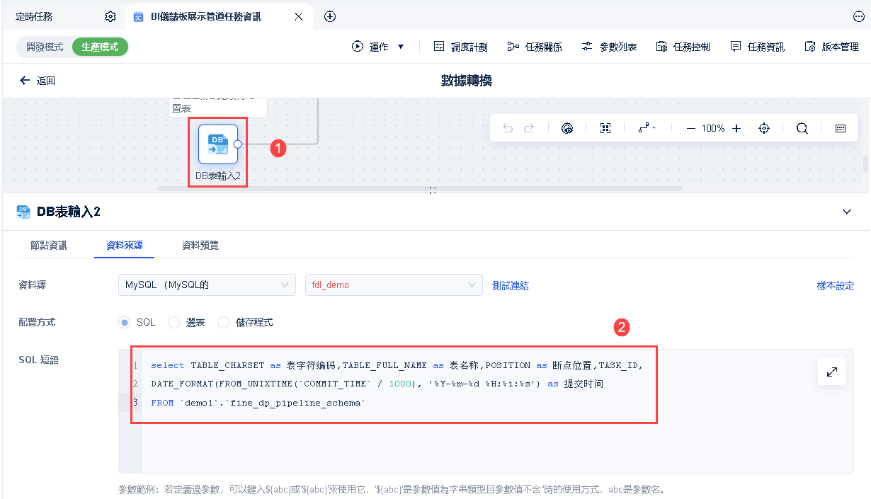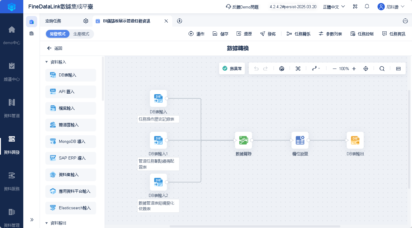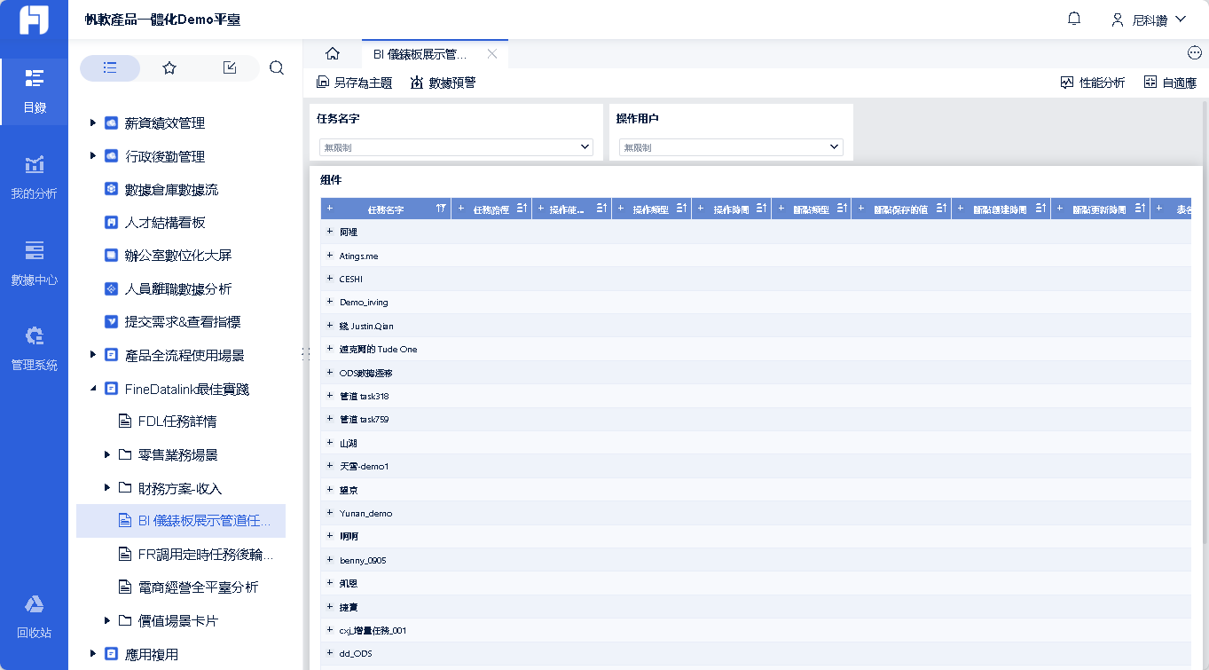 FineDataLink 中的資料處理程式,詳情參見:https://demo.finedatalink.com/ 中的定時任務:「BI儀表板展示管道任務資訊」。