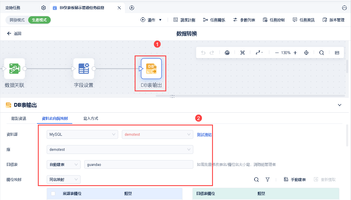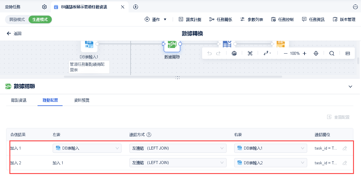 使用者可根據實際需求,使用 FineDB 資料庫中的資料管道表 ,篩選出需要的欄位,最後將多張表進行聯動即可。