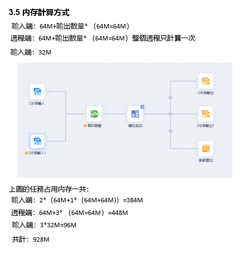 非關係型 DB 表輸入(如簡道雲、Mongo)以及其他輸入類型(如 API 輸入、檔案輸入等),一個 Reader 佔用 64MB 的記憶體