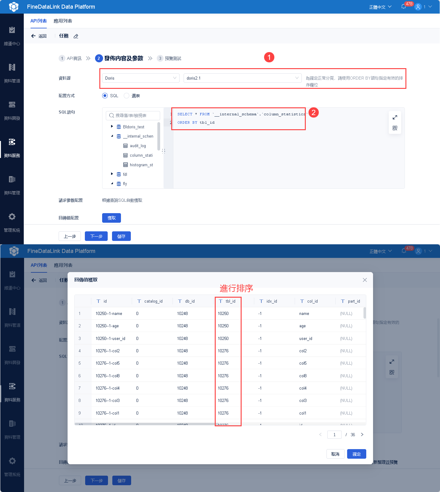 若使用 Doris、StarRocks 作為發佈的資料源,需要使用 ORDER BY 語句指定有效的排序欄位,否則將無法正常分頁,影響後續使用API取數。