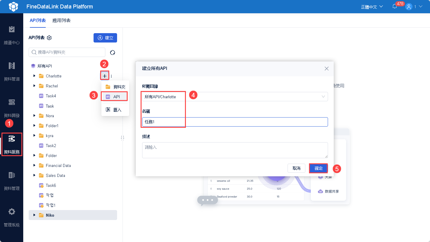 進入 FDL 工程,點選「資料服務」,在有權限的路徑下建立 API,設定 API 所在路徑及名稱後,點選「確定」按鈕。如下圖所示: