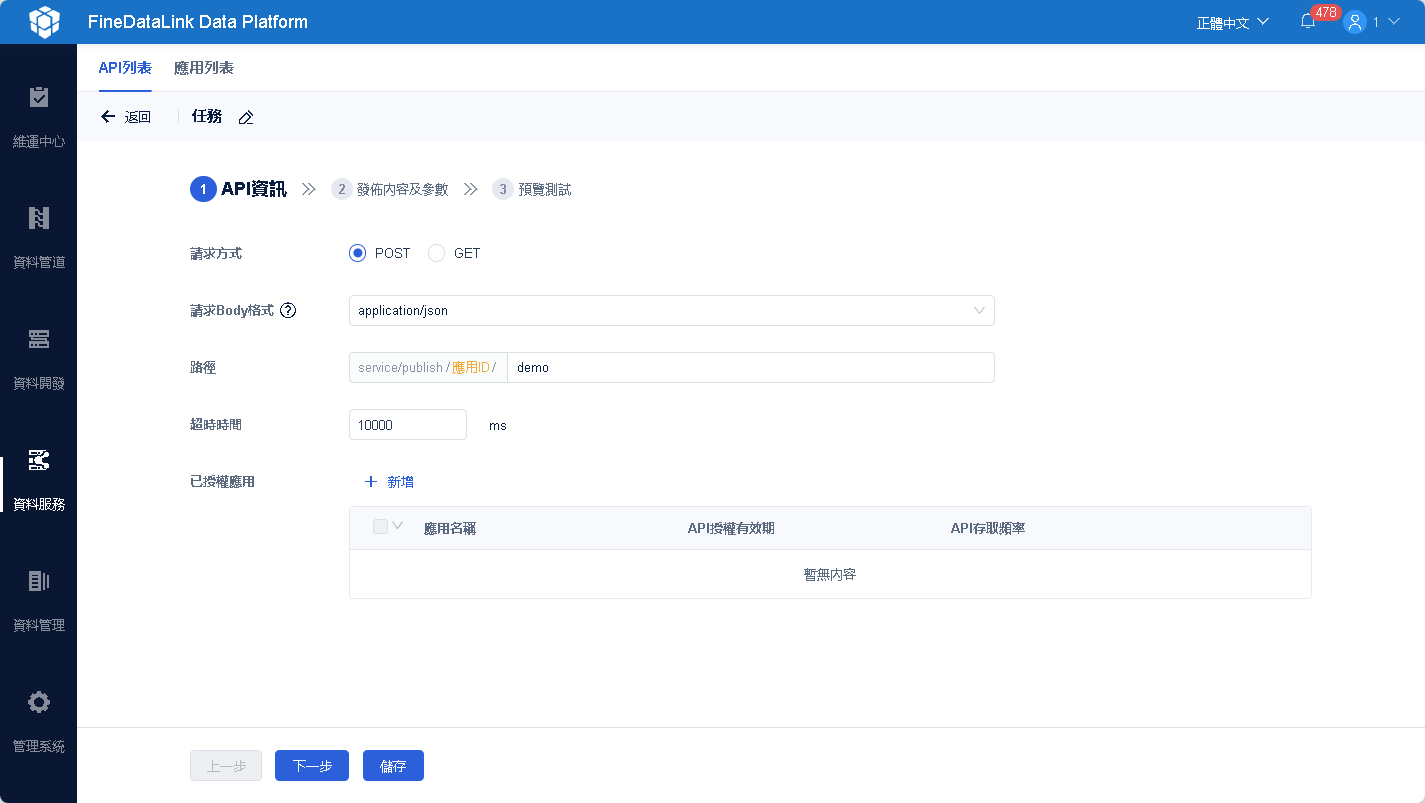 建立一個 API 後,需要 3 步完成該 API 的設計:API 資訊、發佈內容及參數、預覽測試。