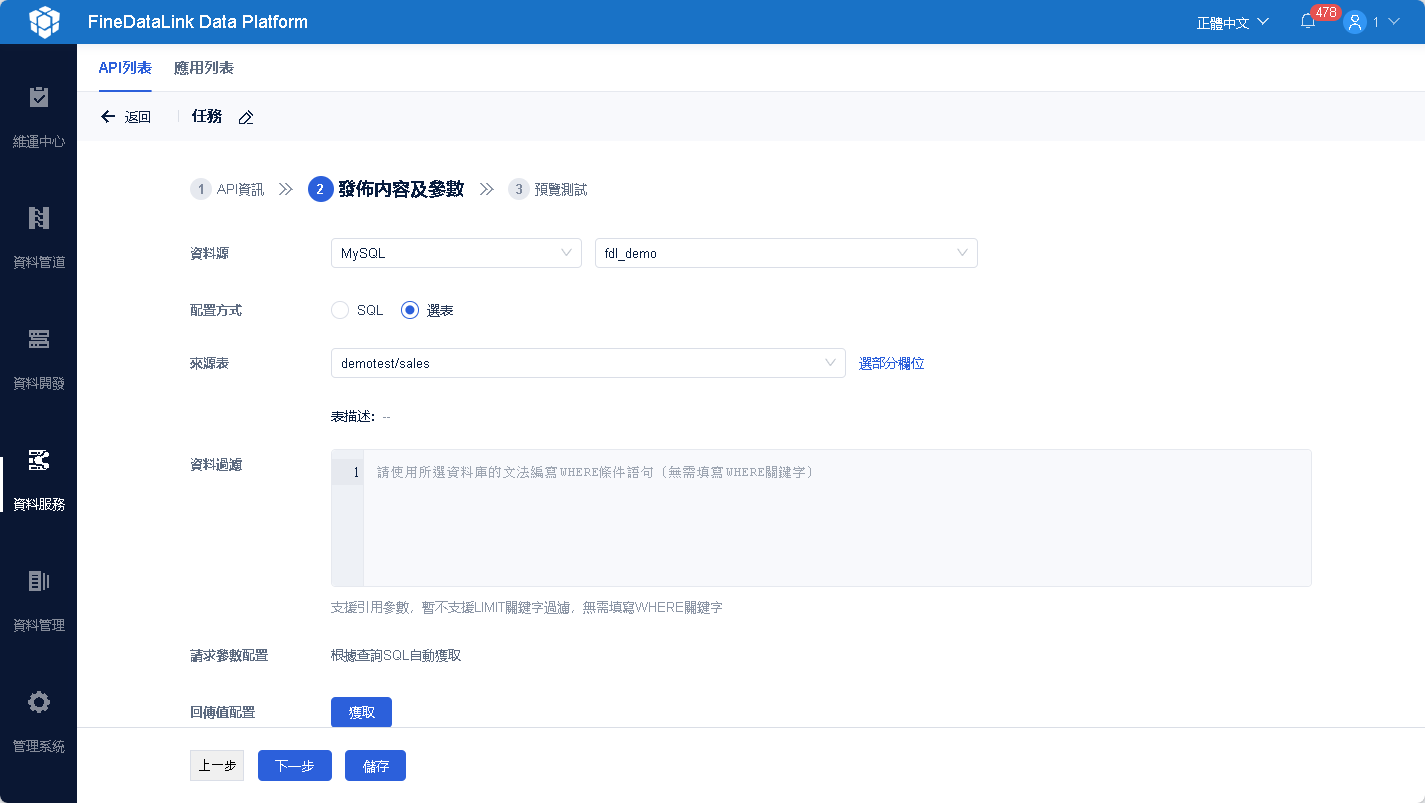 | 路徑 | 配置要發佈的API路徑。 API路徑不允許重複。 預設為空,支援指定英文、數字、底線(_)、連字元(-)、正斜槓(/)。 例如以下完整的API請求路徑範例: http://192.168.5.175:8089/webroot/service/publish/應用ID/demo 注1:service前的部分為發佈API所在的當前 FineDataLink 伺服器地址。 注2:應用ID是API被綁定應用的ID,詳情參見綁定API至應用。 | |