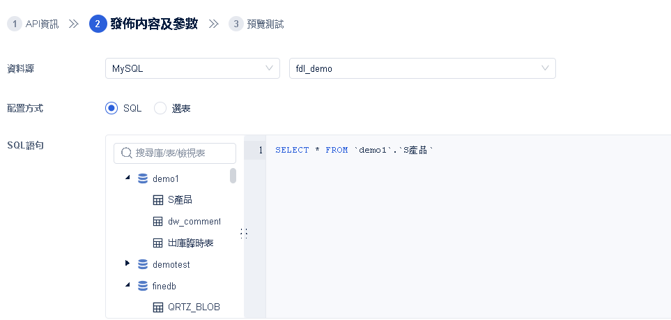 透過 SQL 語句從源資料庫的表中查詢取數,且支援引用參數,參數的具體介紹請參見:參數概述
