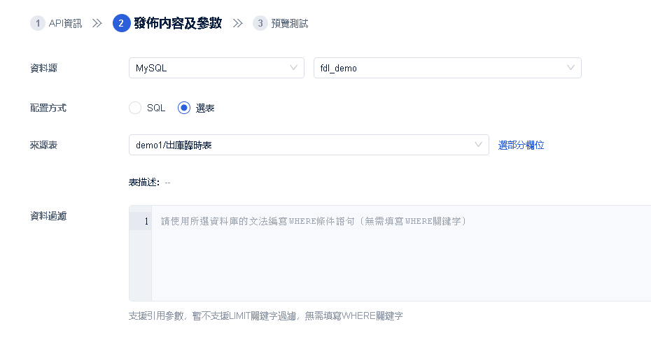 | 4.1.5.4 | 「發佈內容及參數」步驟中,配置方式選擇「選表」時,顯示表備註 |