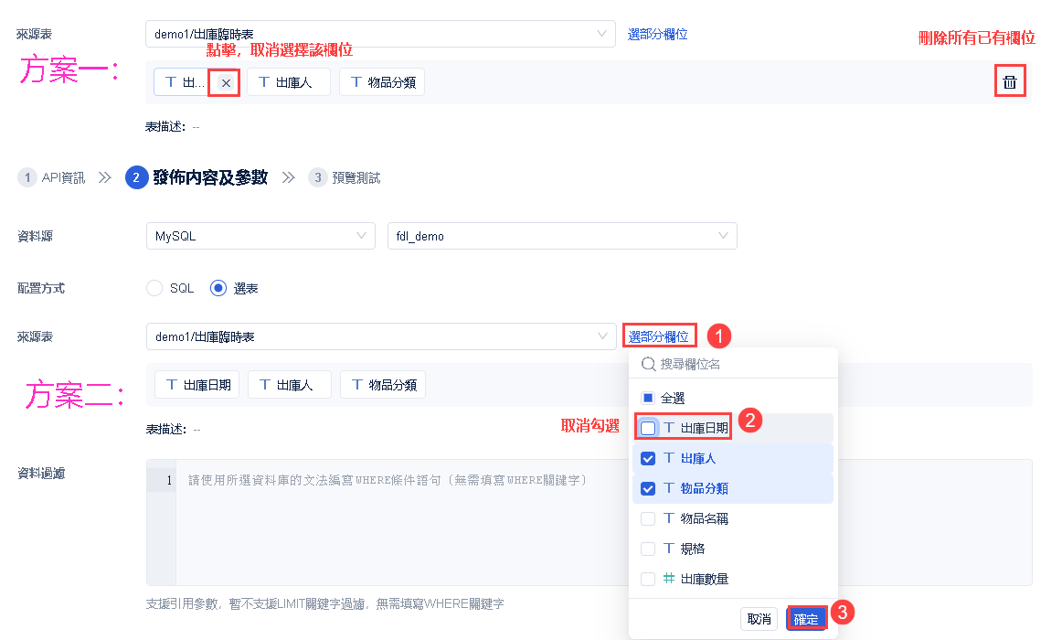 | 選部分欄位 | 4.1.13.2 及之後版本,支援選擇部分欄位: 1)選欄位時若全選欄位,後續該表新增的欄位,不會被當成選中的狀態 2)未選的表欄位,在「資料過濾」功能中,可被聯想出來 3)已被選擇的欄位,若希望取消選擇,有兩種方案: