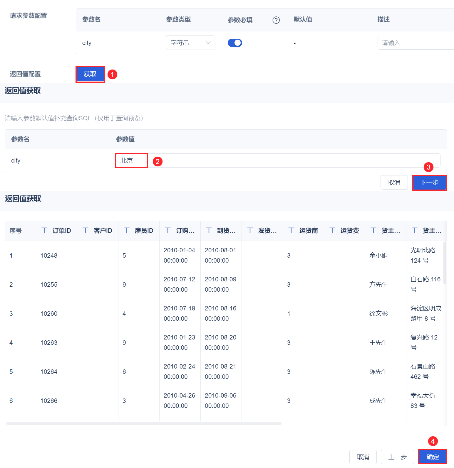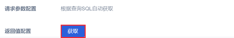 「請求參數配置」中提示:根據查詢SQL自動獲取;回傳值配置中點選「獲取」按鈕,獲取傳回參數。