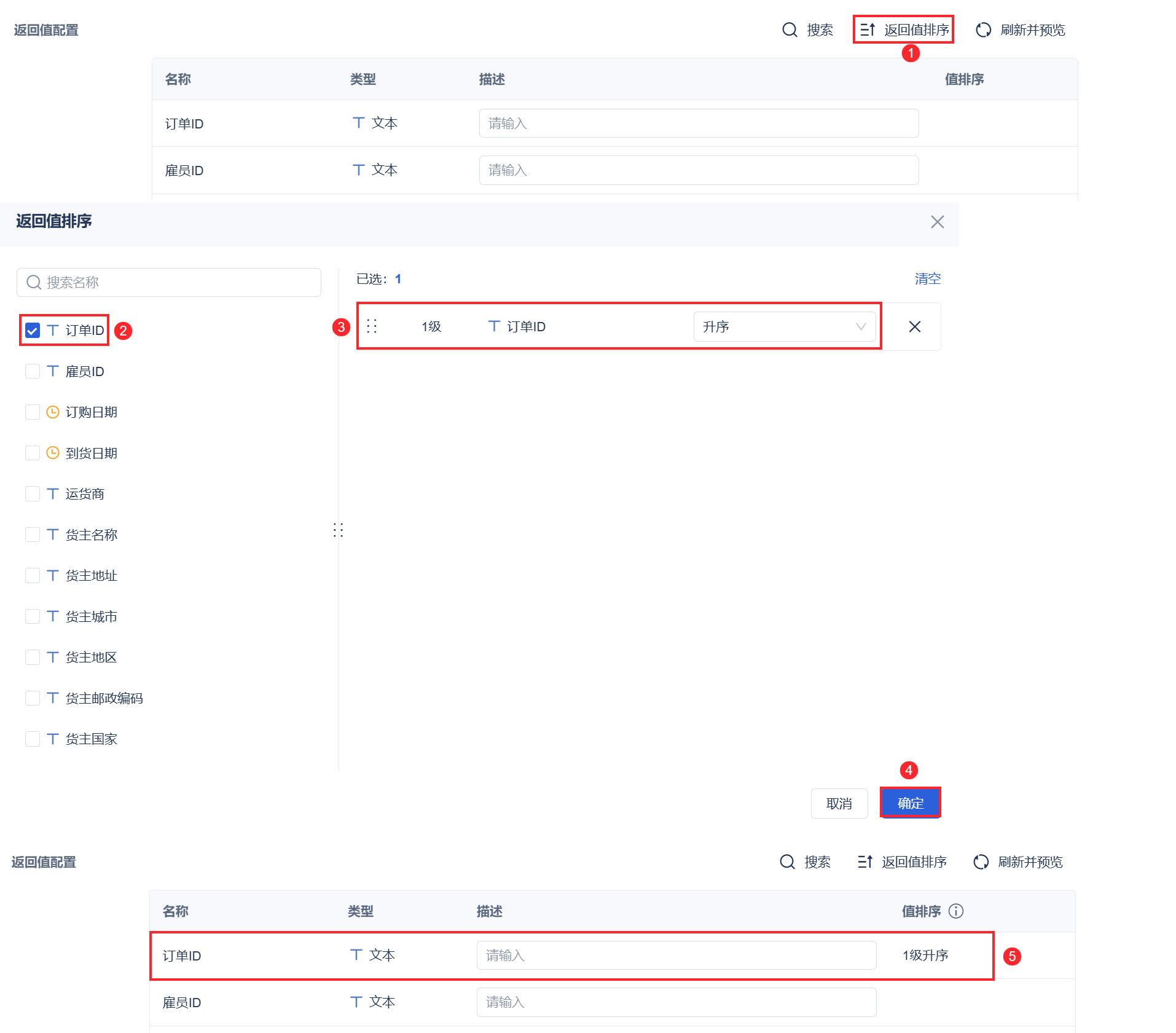 4.2.0.3 及之後版本,回傳值配置中點選「獲取」按鈕後,支援指定排序欄位和排序規則。