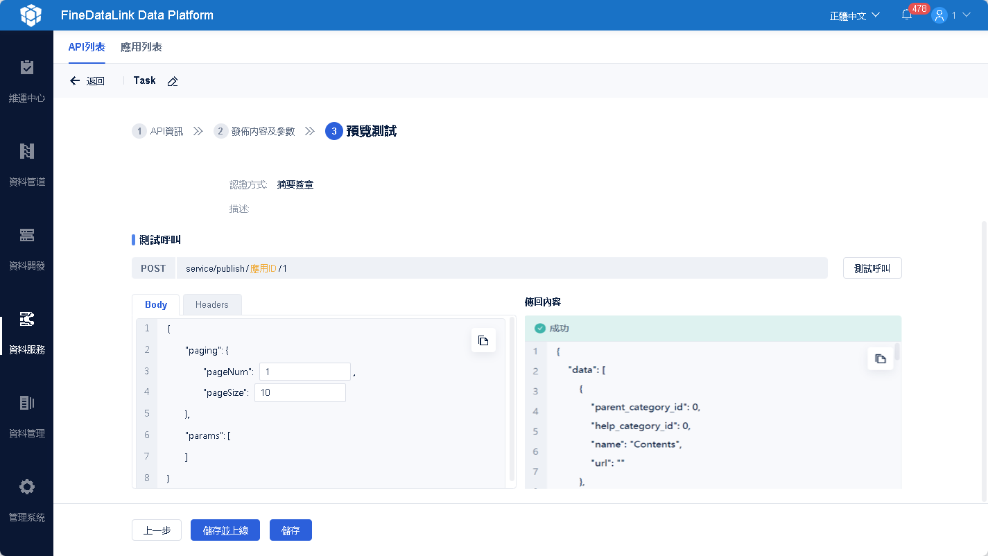發佈 API 注:4.1.6.3 及之後版本,API任務、資料服務應用禁止被多人同時編輯。詳情請參見:任务禁止被多人同时编辑 | 資料服務支援使用簡單身分認證及加密身分認證呼叫資料服務API,可根據需要選擇 | 摘要簽章認證方式 |