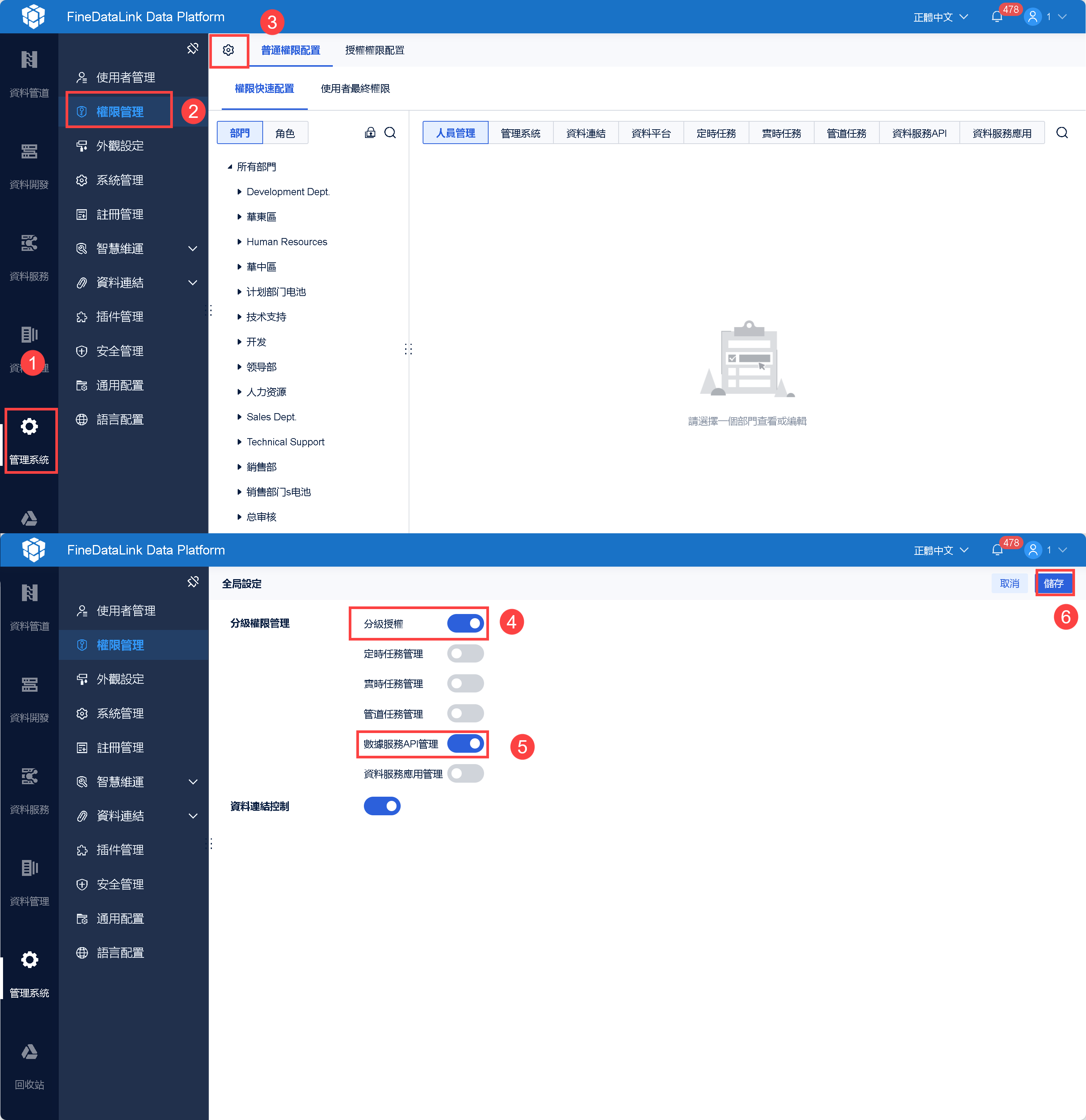 超級管理者登入 FineDataLink,點選「管理系統>權限管理>全局設定」,開啟「分級授權」和「資料服務API管理」,如下圖所示: