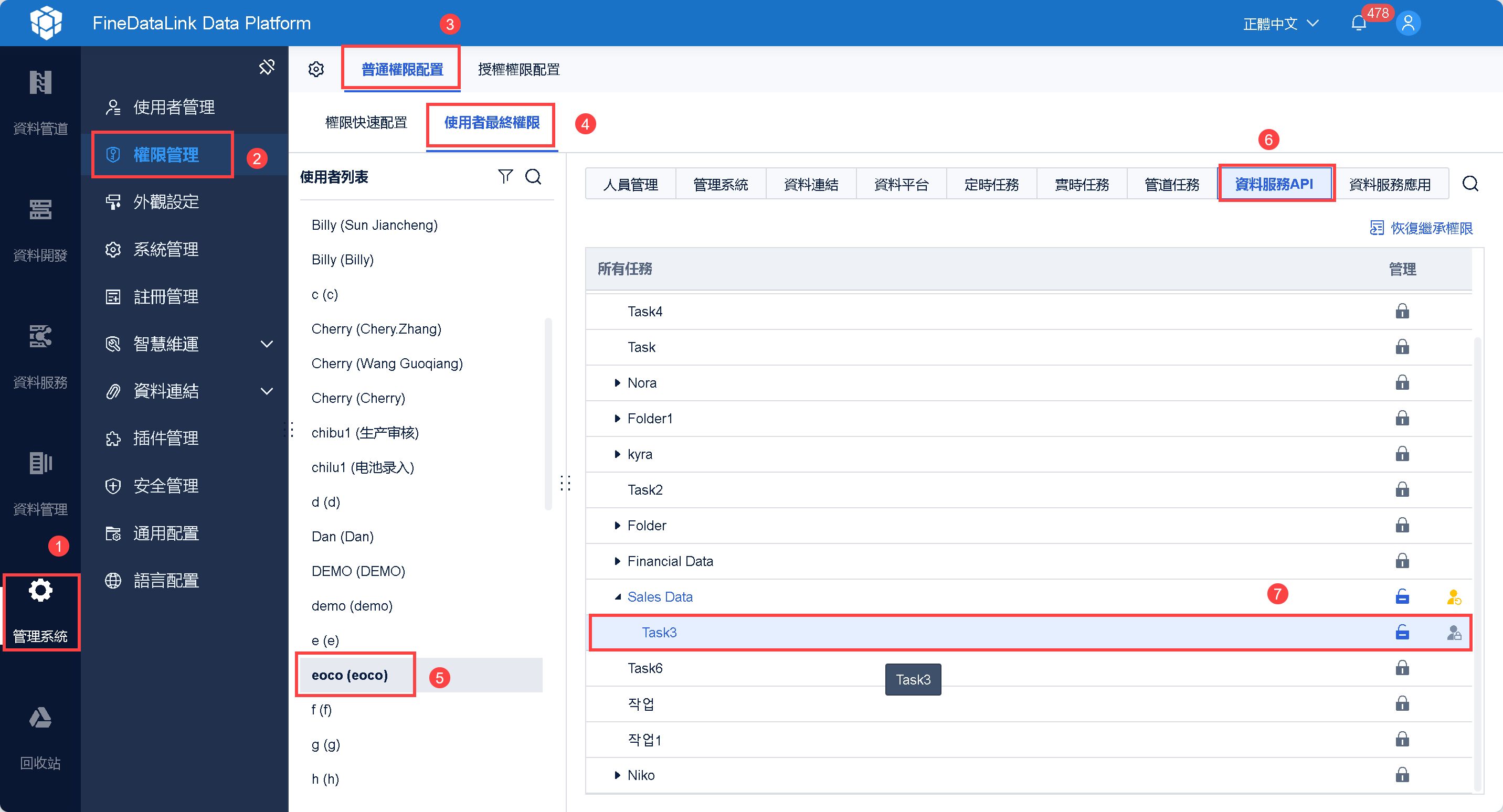 登入 eoco 帳號,點選「管理系統>權限管理>普通權限配置」,可給「人力資源」部門分配「財務資料」資料夾下所有資料服務任務的管理權限。如下圖所示: