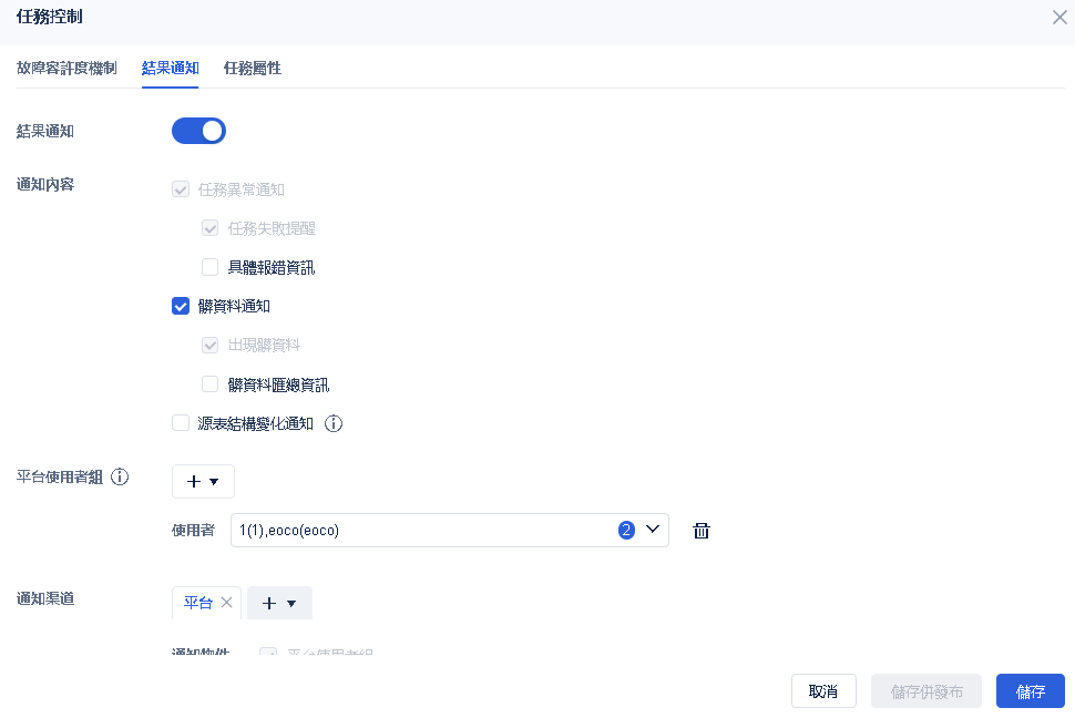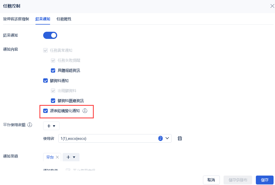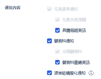 為了保證定時任務的來源表 DDL 變化能通知使用者,可在「任務控制>結果通知」下設定通知情況。當運作中的任務出現來源表的 DDL 變化時,即會通知資訊給使用者。如下所示: