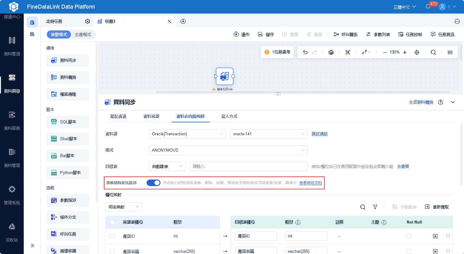 | 使用前提 | 資料同步節點中資料來源「配置方式」選擇「選表」 資料去向與映射中勾選了「源表結構變化監測」 |