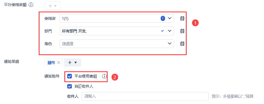 2)通知渠道選擇簡訊/信箱時,「自訂收件人」與「平台使用者組」不能同時為空。