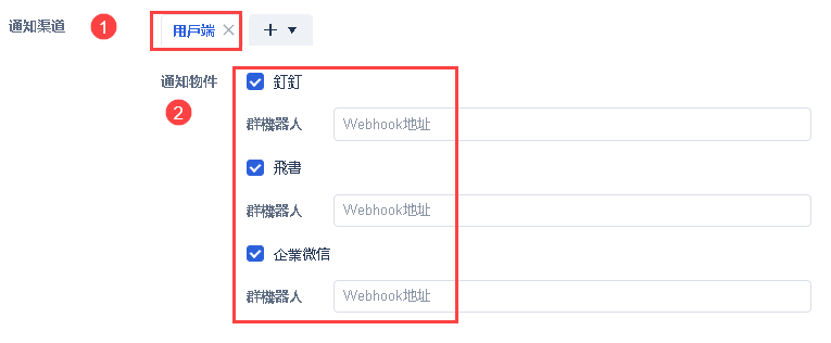 通知渠道選擇「用戶端」時,可設定通知渠道為釘釘/飛書/企業微信。