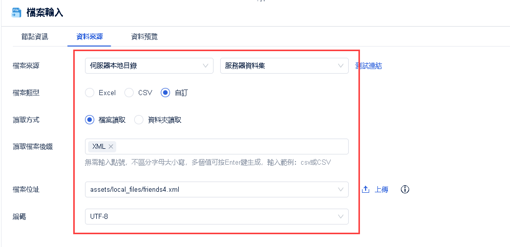 2)拖入「檔案輸入」算子,讀取 XML 檔案。如下圖所示: