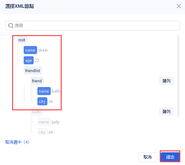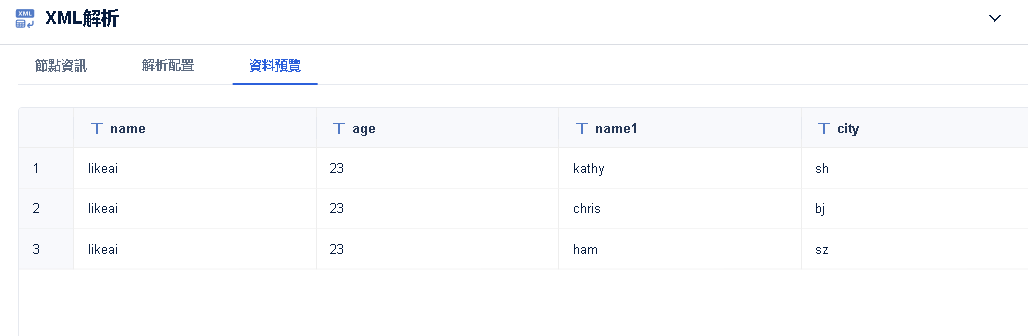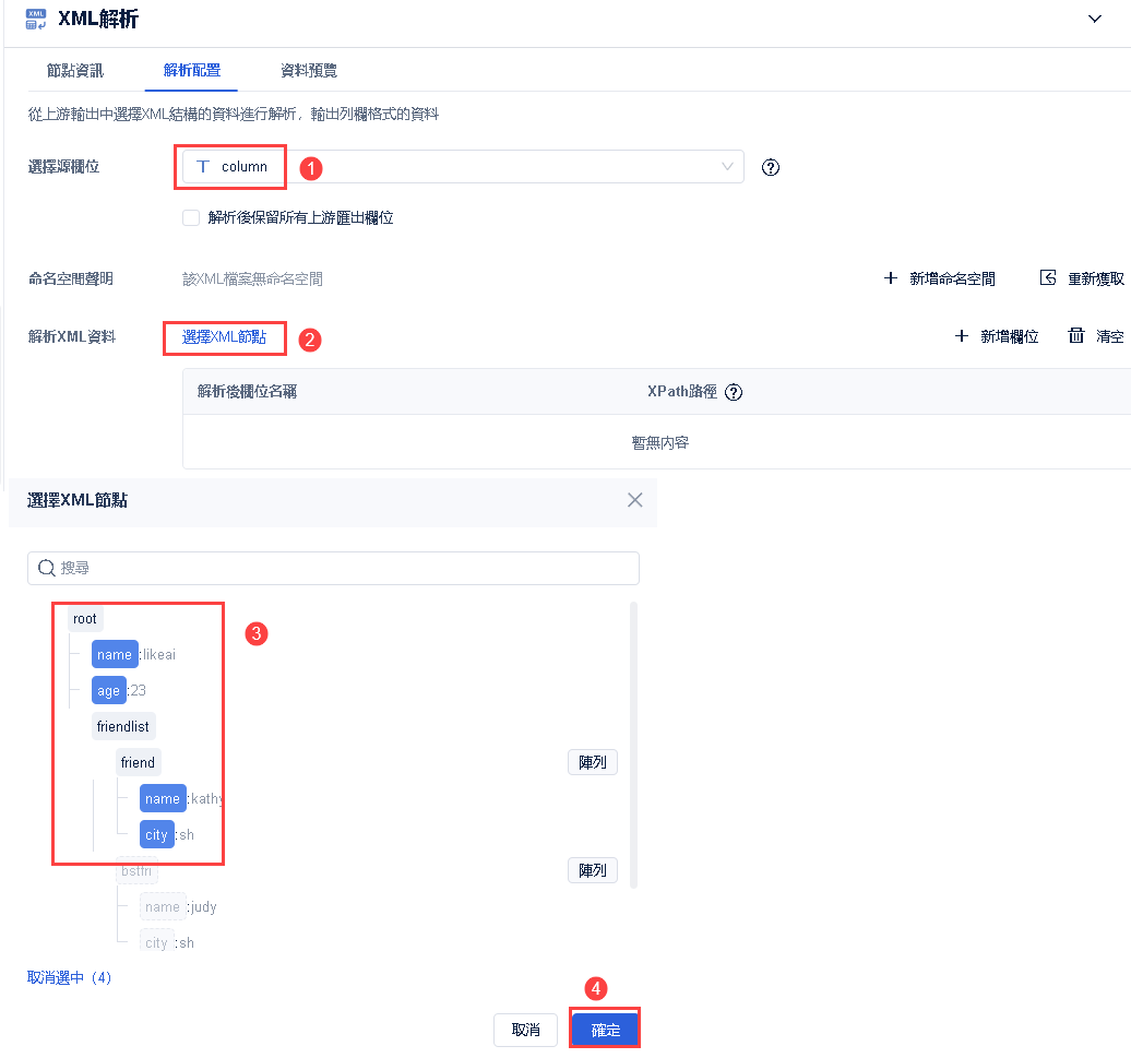 3)拖入「XML解析」算子,XML 節點設定如下: