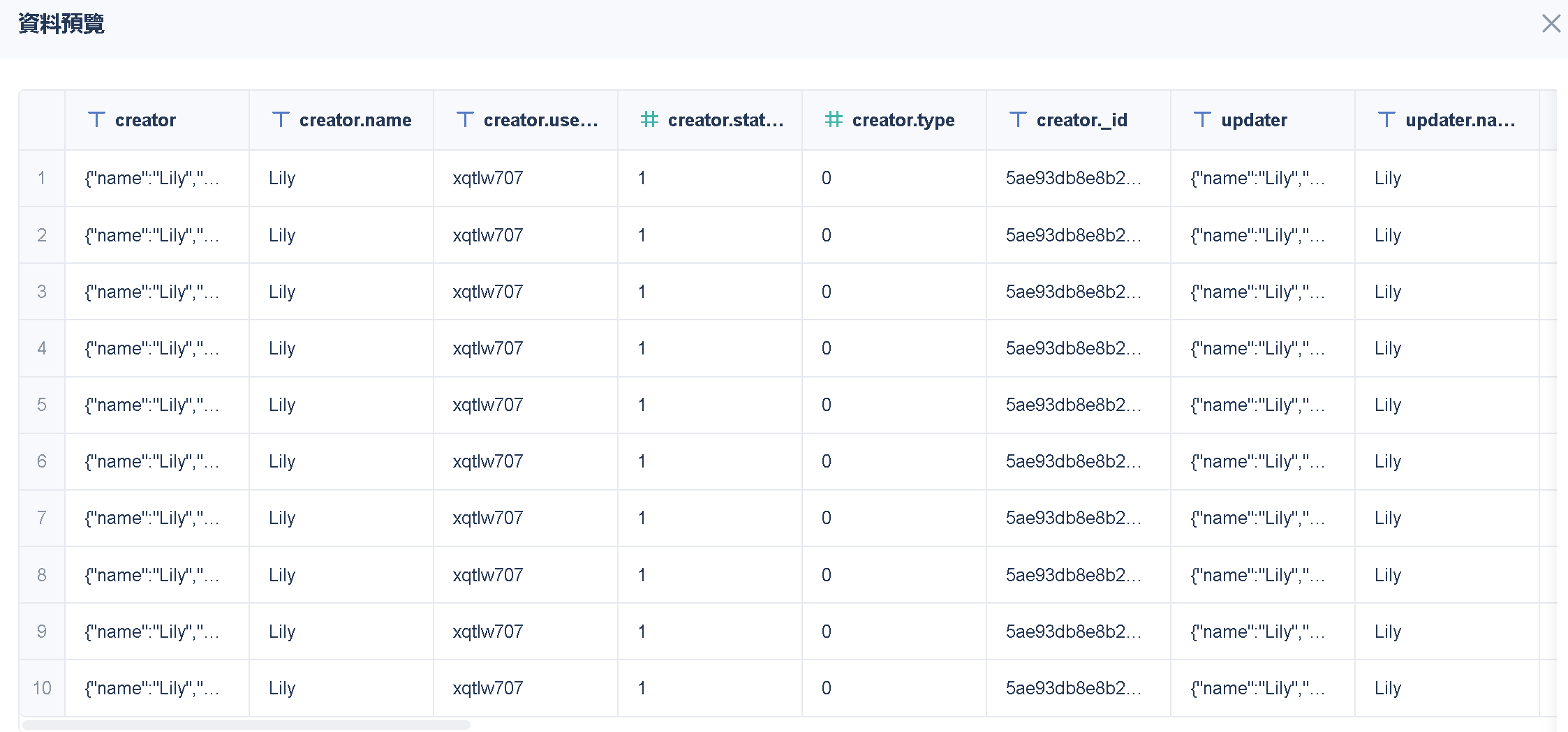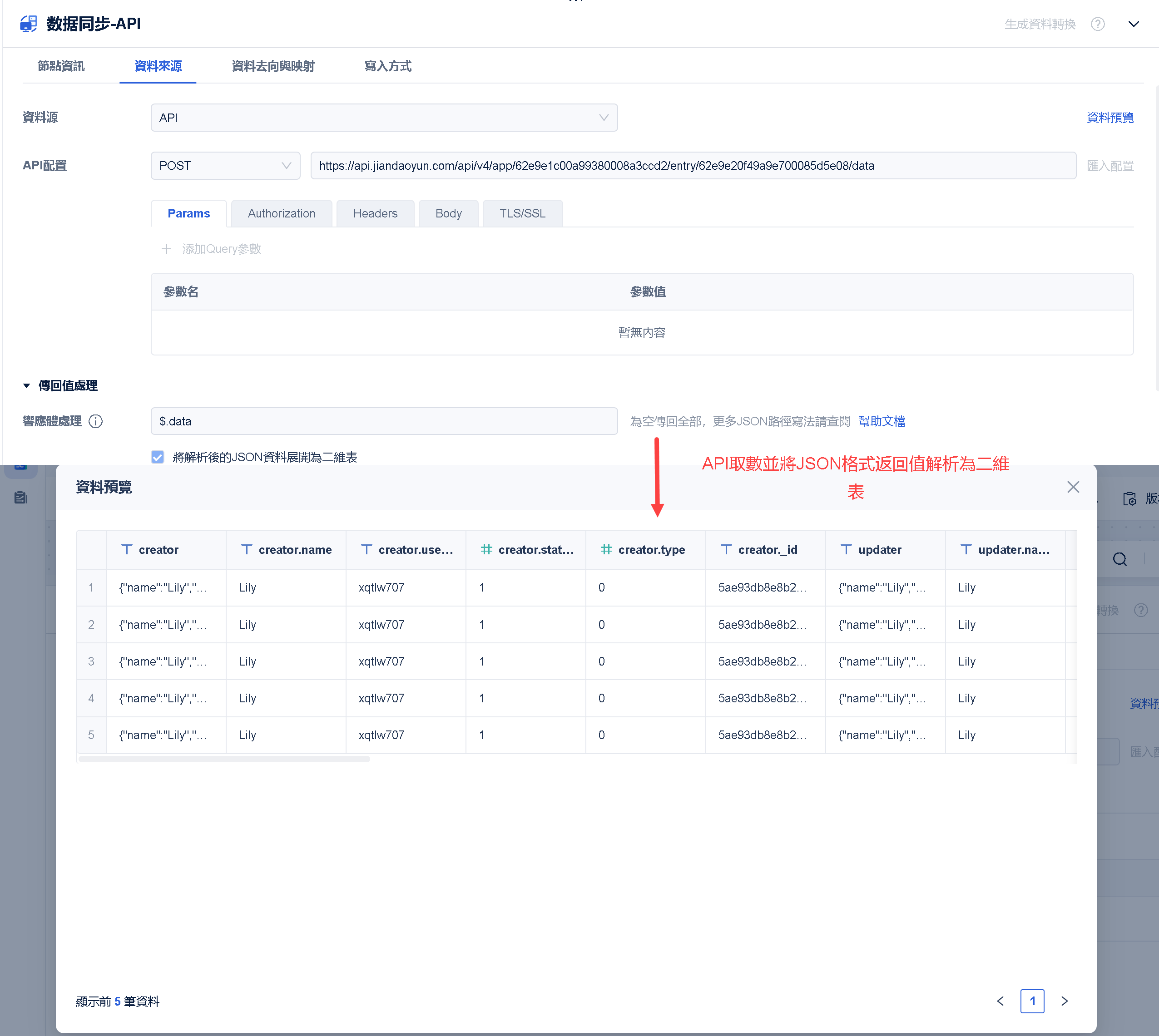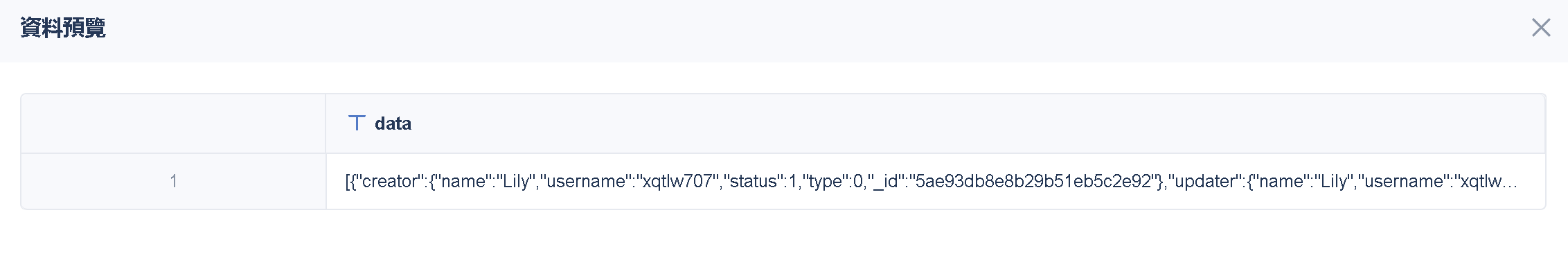 本文範例中,回應體處理中輸入$.data,解析 data 欄位。點選「資料預覽」,如下圖所示: