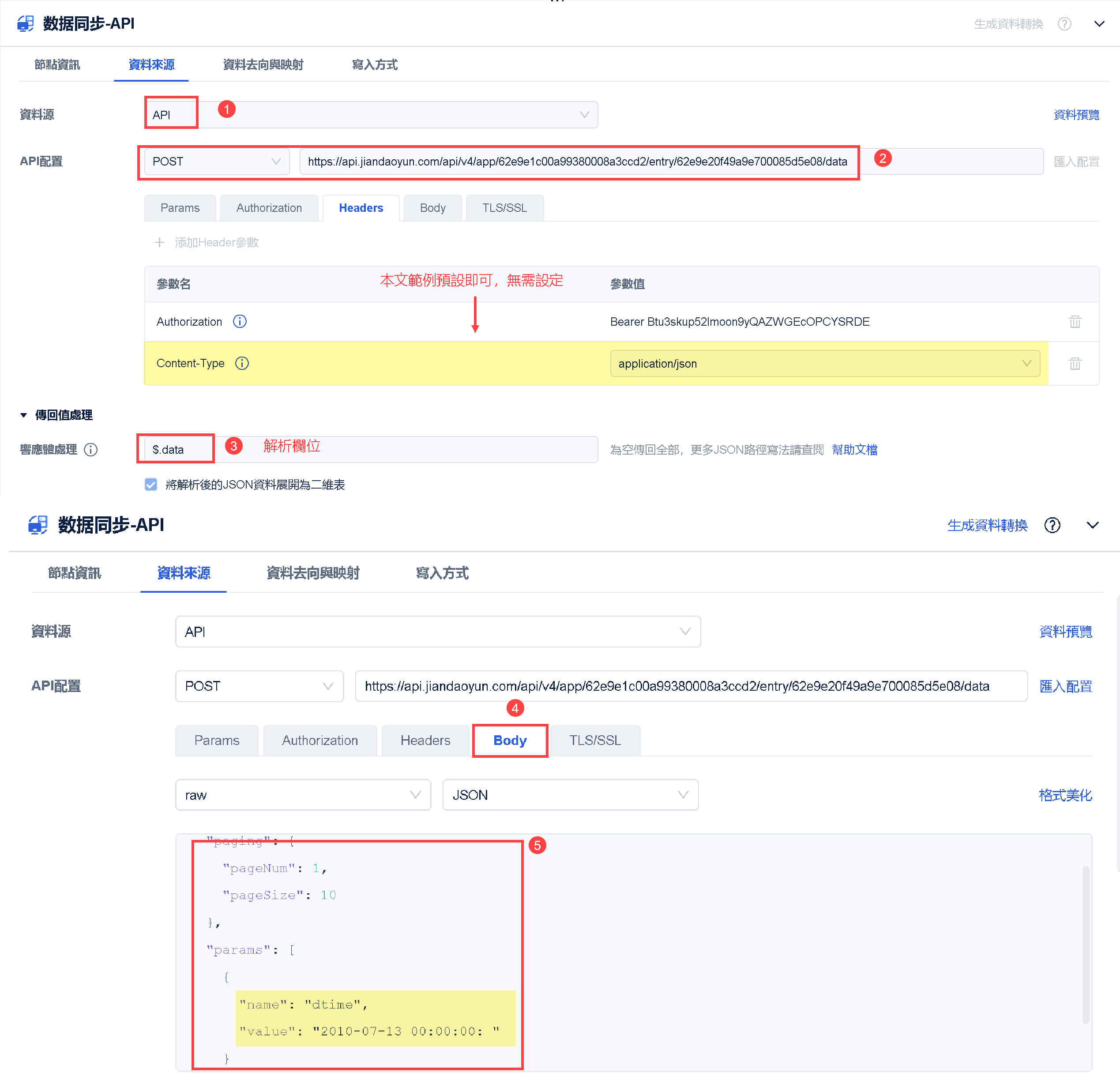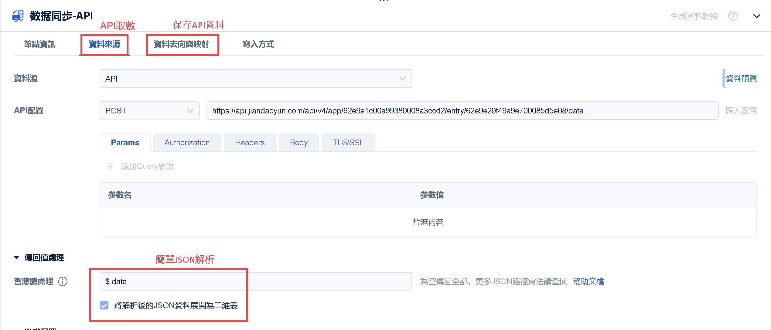 | 「資料同步-API」功能(本文介紹功能) | 若API回傳值為較簡單的 JSON 格式,不需要複雜的解析處理,可參考本文進行API取數 |