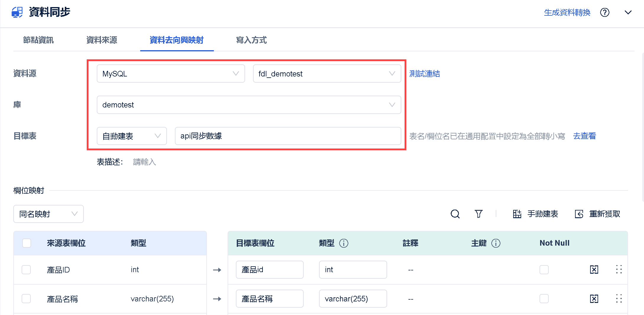 3)點選「資料去向與映射」Tab,可將取出的API資料儲存到資料庫中。如下圖所示: