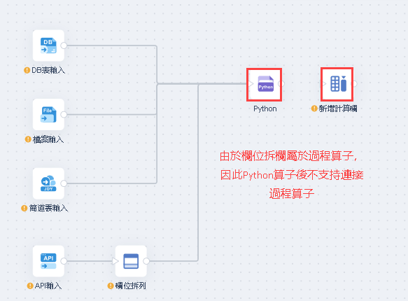 2)「Python 算子」不能放在兩個程式性算子中間。。如果「Python 算子」上游輸入源全是輸入類算子,則 Python 算子後面可以接程式型(除欄位設定算子外的其他「連結」、「轉換」、「實驗室」算子)算子。如果 Python 算子上游輸入源存在程式型算子,則 Python 算子後面只能接匯出型算子。