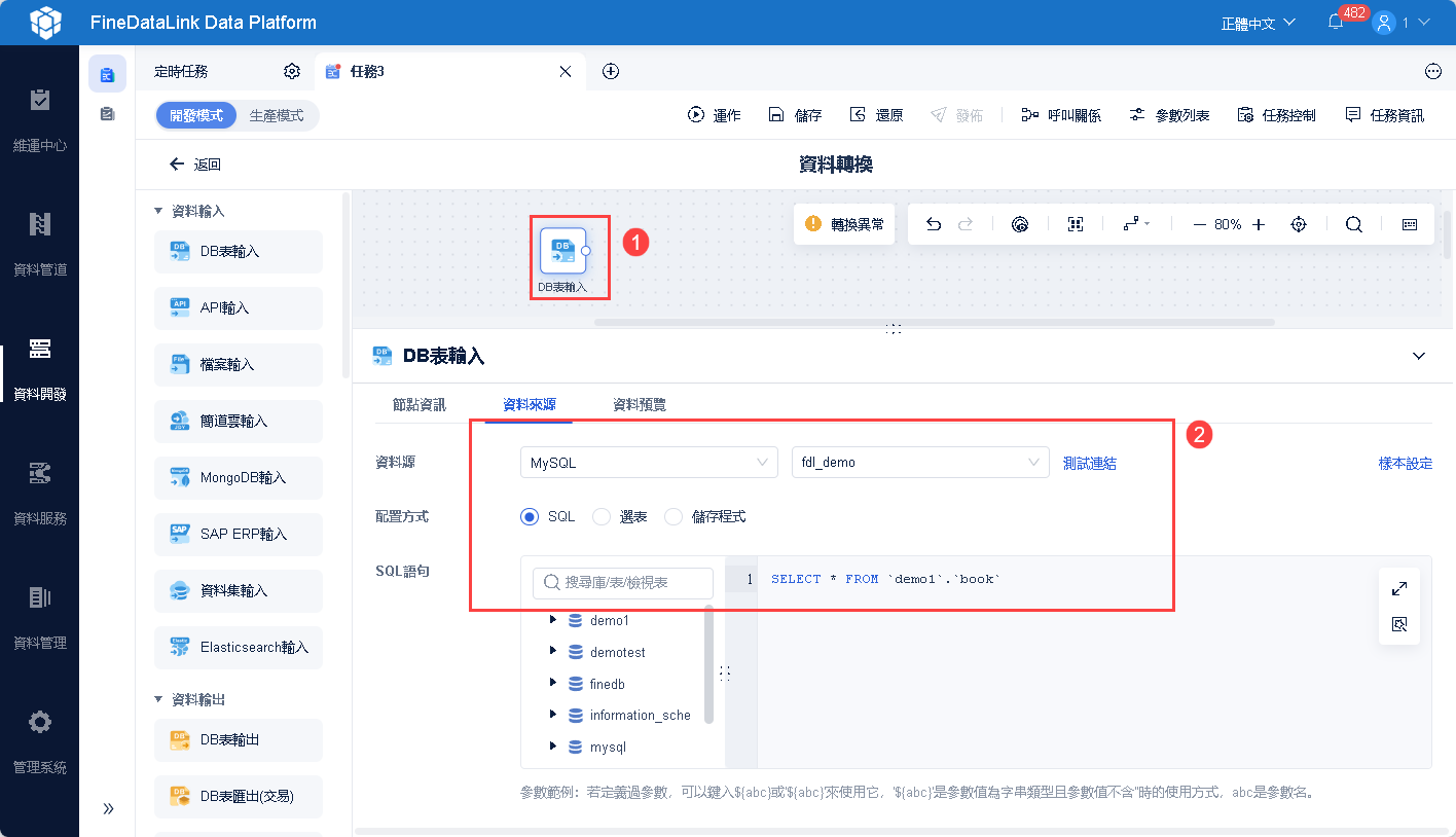 2)拖入「DB表輸入」算子,取出 book 表資料。如下圖所示: