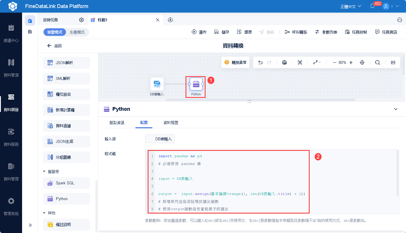 在資料開發程式中,對於一些複雜的資料處理(比如使用視覺化算子或者 SparkSQL 較難實現的),需要在「資料轉換」節點中使用 Python 腳本處理資料。