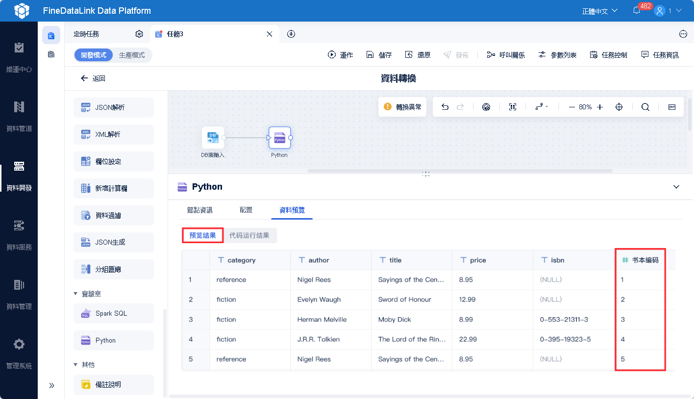 「資料轉換」節點中新增「Python 算子」,可呼叫 Python 腳本進行復雜資料處理。如下圖所示: