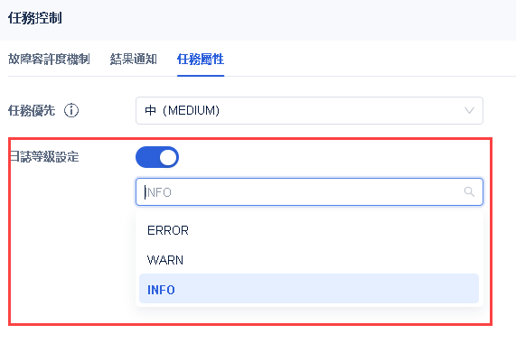使用者可在「任務控制>任務屬性>日誌等級設定」中,為定時任務單獨設定日誌匯出級別,滿足使用者按需查看日誌、除錯和排錯的需求。