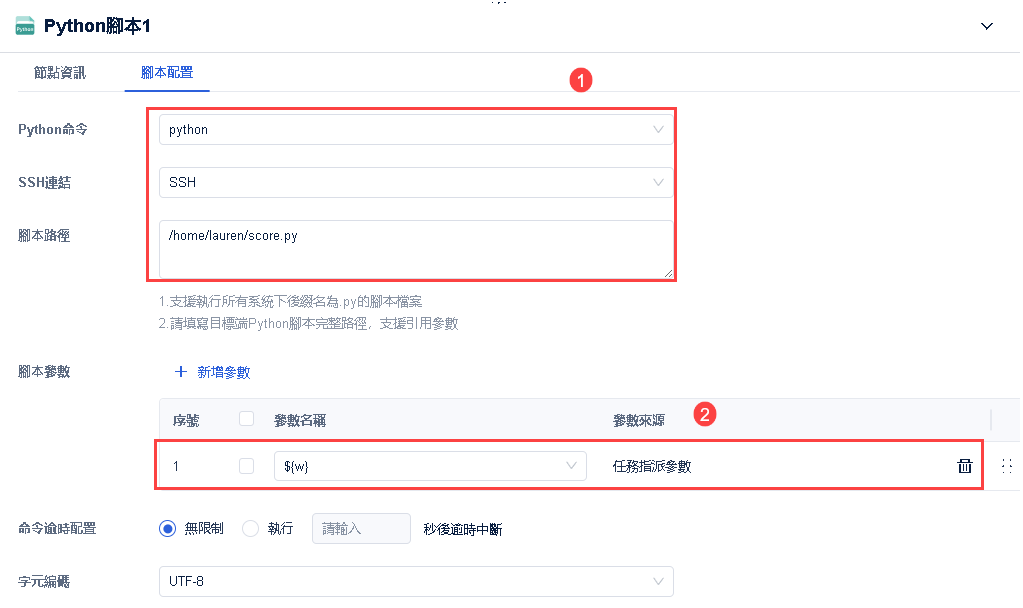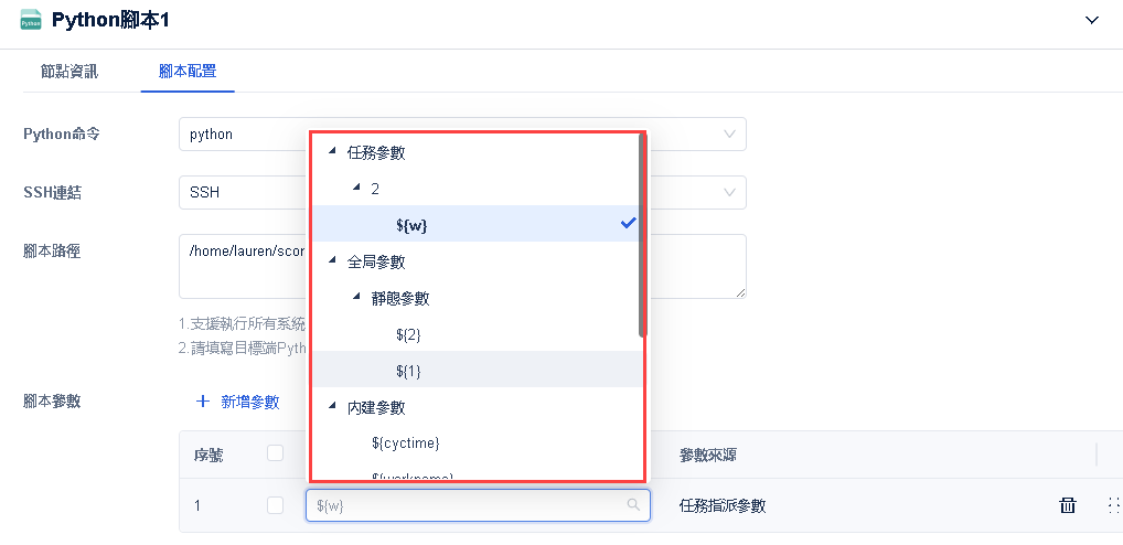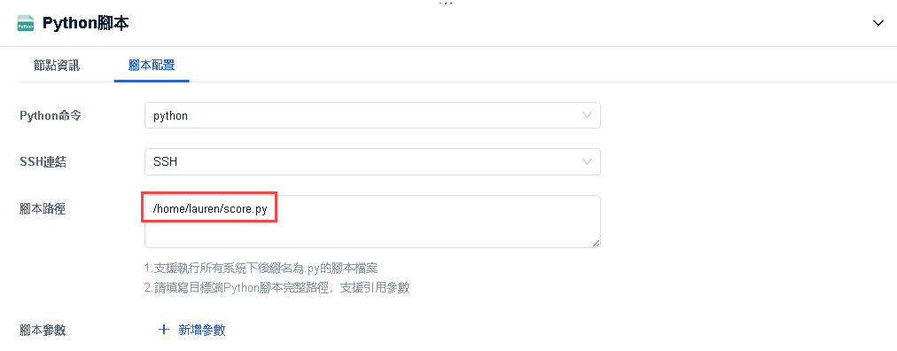 拖入「Python腳本」節點,設定要執行的 Python 腳本檔案,新增 4.3 節設定的腳本參數。如下圖所示: